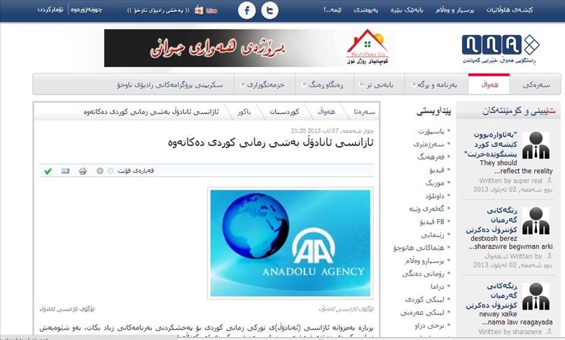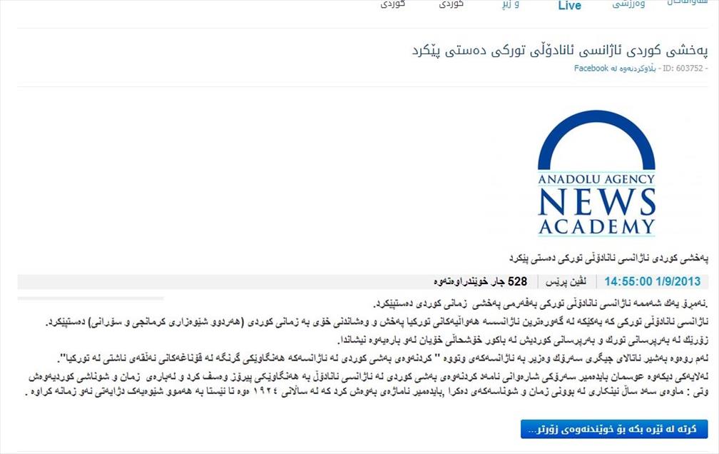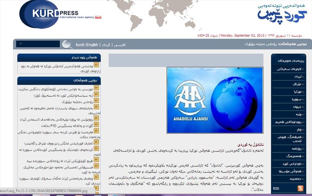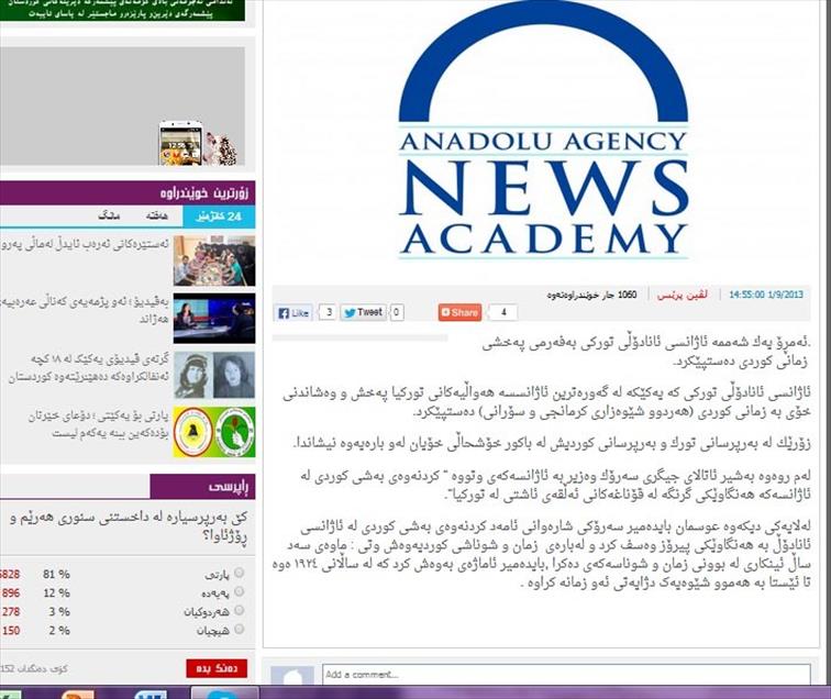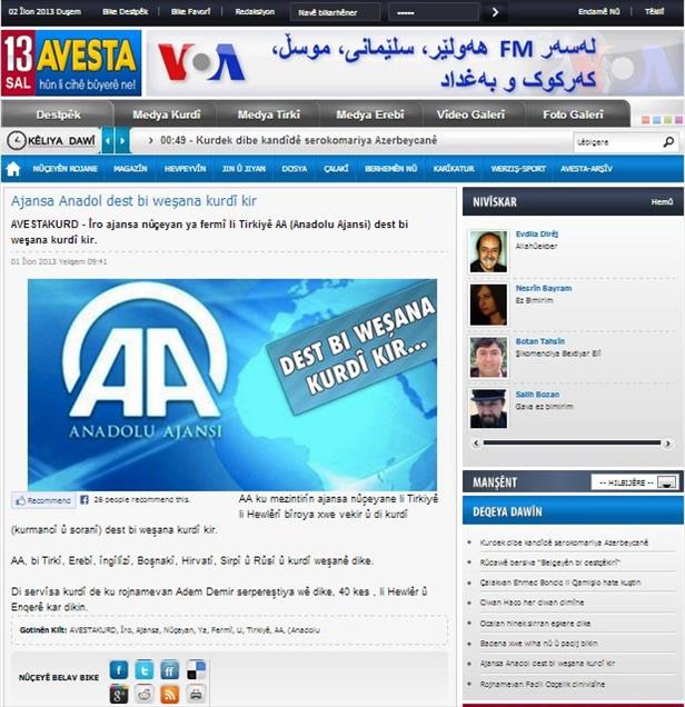 Anadolu Ajansı'nın, yayın dilleri arasına Kürtçeyi de katması, Kürt medyasında geniş yer buldu. Irak'ın Kürt Bölgesel Yönetimi'nde (IKBY) yayın yapan gazete, televizyon, haber ajansları ve internet siteleri, AA'nın altıncı dil olarak Kürtçe yayına başlamasının öneminden söz eden haber ve yorumlara yer verdi. (AA - Anadolu Ajansı)AA
