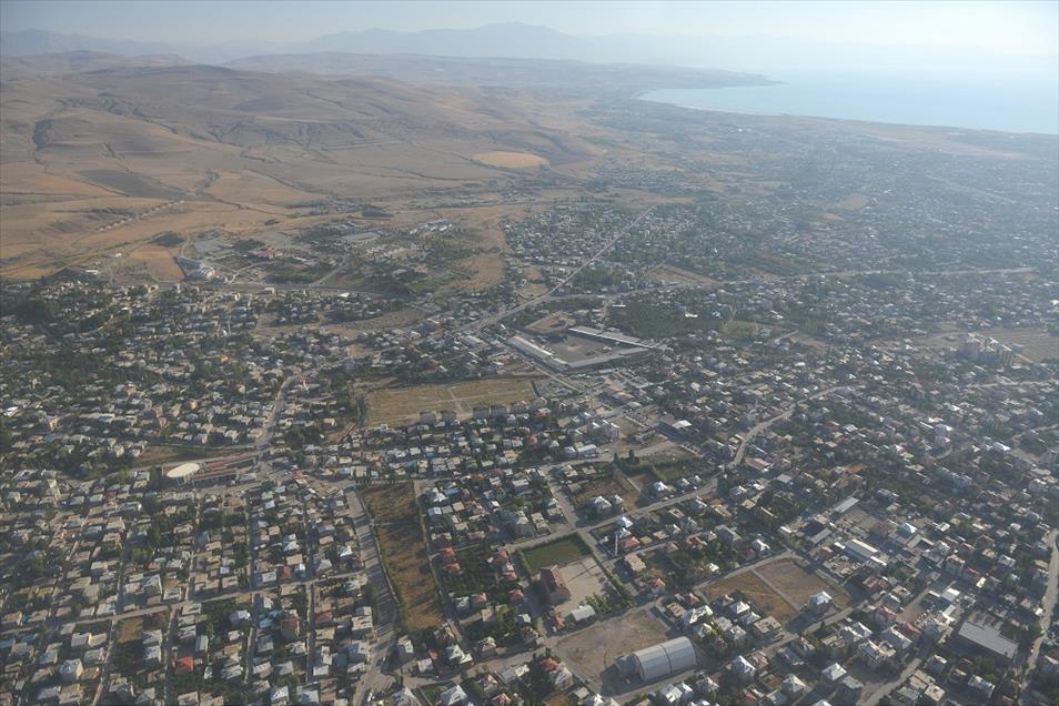 Van ve Hakkari illerinin, yüksek dorukları, akarsuları, ovaları, tarım arazileri, yeşillik alanları, yolları, mahalle ve köyleri, metrelerce yükseklikten helikopterle kuş bakışı görüntülendi. Fotoğrafta, Van Gölü kıyılarına kurulan Van şehrinden genel bir görünüm yer almakta. (Özkan Bilgin - Anadolu Ajansı)Özkan Bilgin