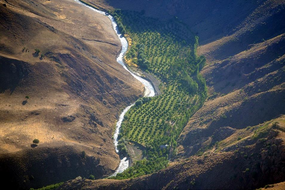 Van ve Hakkari illerinin, yüksek dorukları, akarsuları, ovaları, tarım arazileri, yeşillik alanları, yolları, mahalle ve köyleri, metrelerce yükseklikten helikopterle kuş bakışı görüntülendi. Fotoğrafta, Hakkari sınırlarında bulunan bir akarsu ve yamacındaki bir meyve bahçesi yer almakta. (Özkan Bilgin - Anadolu Ajansı)Özkan Bilgin