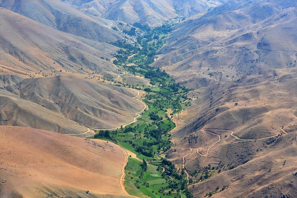 Van ve Hakkari illerinin, yüksek dorukları, akarsuları, ovaları, tarım arazileri, yeşillik alanları, yolları, mahalle ve köyleri, metrelerce yükseklikten helikopterle kuş bakışı görüntülendi. Fotoğrafta, Van'ın Başkale ilçesi sınırlarında bulunan bir vadide yer alan mahalleden genel bir görünüm yer almakta. (Özkan Bilgin - Anadolu Ajansı)Özkan Bilgin
