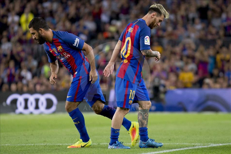İspanya Birinci Futbol Ligi (La Liga) 5. hafta mücadelesinde, Barcelona ile Atletico Madrid takımları Nou Camp Stadı’nda karşı karşıya geldi. Bir pozisyonun ardından sakatlık geçiren Barcelonalı futbolcu Lionel Messi (solda), yerini Arda Turan'a (sağda) bıraktı. ( Albert Llop - Anadolu Ajansı )Albert Llop