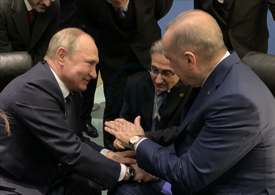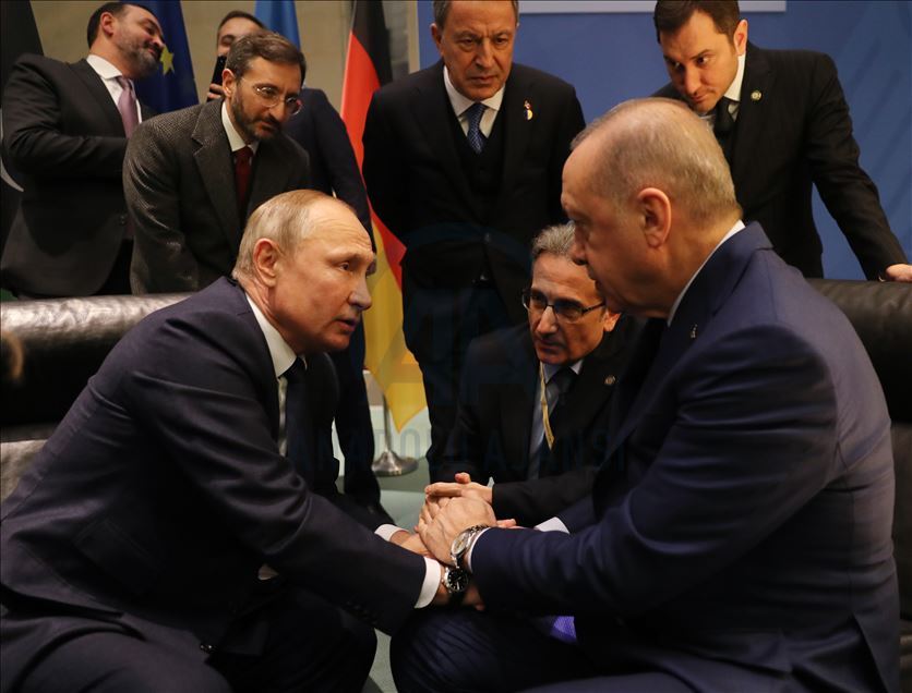 Libya'da kalıcı ateşkes ve siyasi sürecin başlatılması amacıyla Berlin'de düzenlenen uluslararası konferans Almanya Başbakanı Angela Merkel'in ev sahipliğinde başladı. Konferansa katılan Türkiye Cumhurbaşkanı Recep Tayyip Erdoğan (sağda) ile Rusya Devlet Başkanı Vladimir Putin (solda) sohbet etti. ( Cumhurbaşkanlığı / Murat Çetinmühürdar - Anadolu Ajansı )Cumhurbaşkanlığı / Murat Çetinmühürdar
