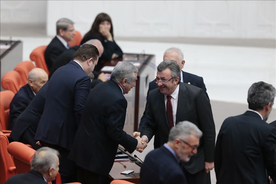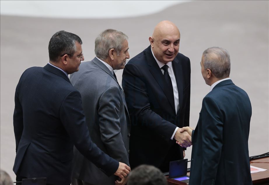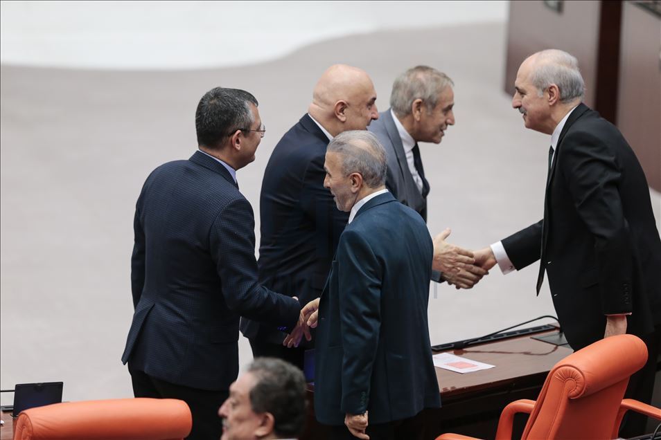 TBMM Genel Kurulu, Libya'ya asker gönderilmesine ilişkin Cumhurbaşkanlığı tezkeresini görüşmek üzere Meclis Başkanı Mustafa Şentop başkanlığında toplandı. Oturum öncesi CHP Genel Başkan Yardımcısı Yıldırım Kaya ile CHP Grup Başkanvekilleri Özgür Özel ve Engin Özkoç , AK Parti Genel Başkanvekili Numan Kurtulmuş ve AK Parti Grup Başkanı Mehmet Naci Bostancı ile selamlaştı. ( Metin Aktaş - Anadolu Ajansı )Metin Aktaş