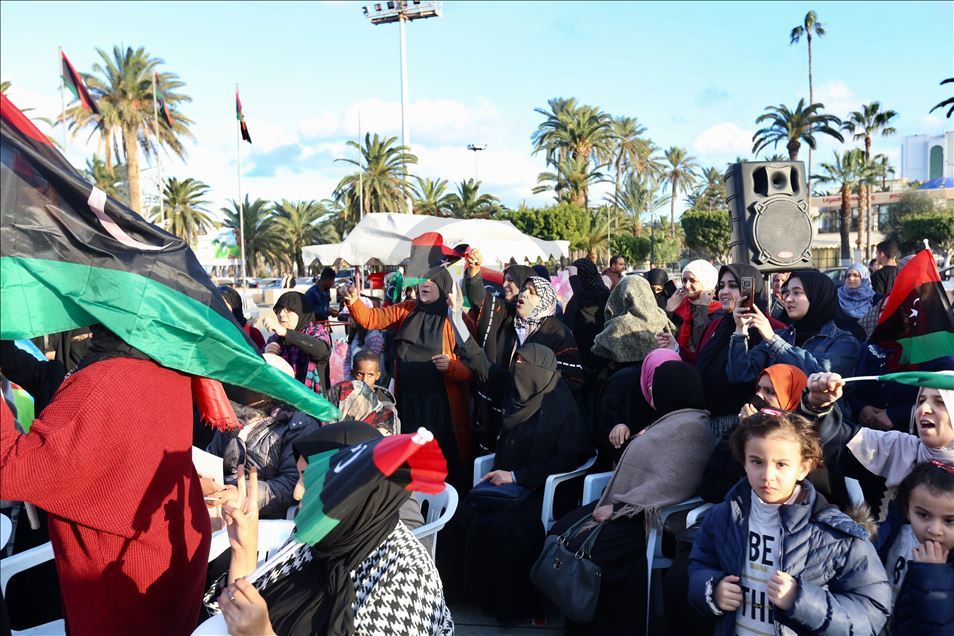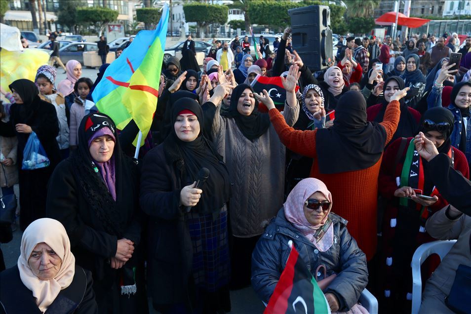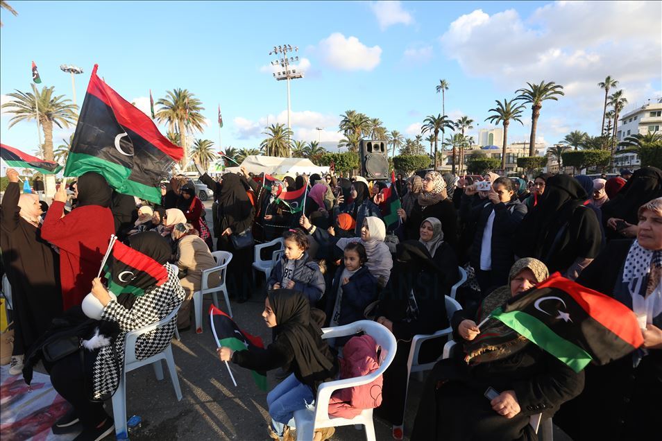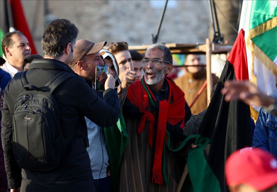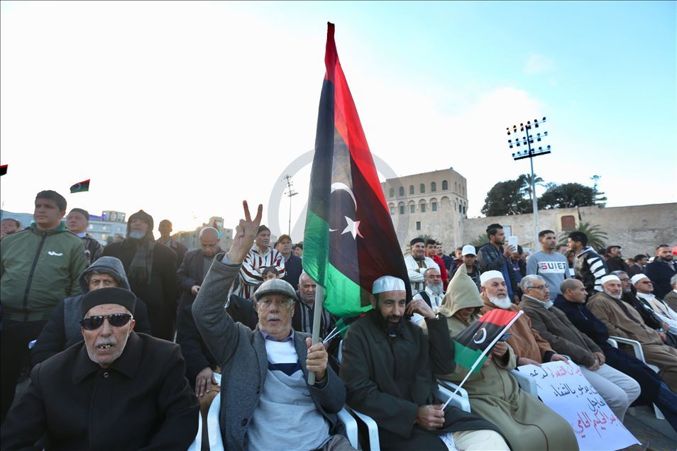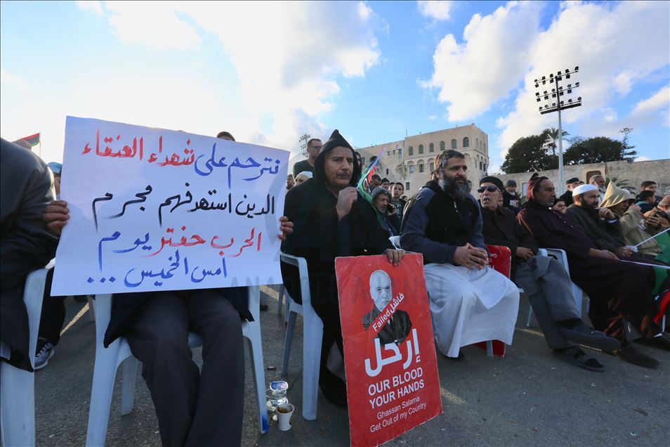 Libya'nın başkenti Trablus'taki Şüheda Meydanı'nda toplanan vatandaşlar, darbeci general Halife Hafter güçlerinin başkent ve çevresine düzenlediği saldırıları protesto etti. Göstericiler, Hafter karşıtı dövizler taşıdı.