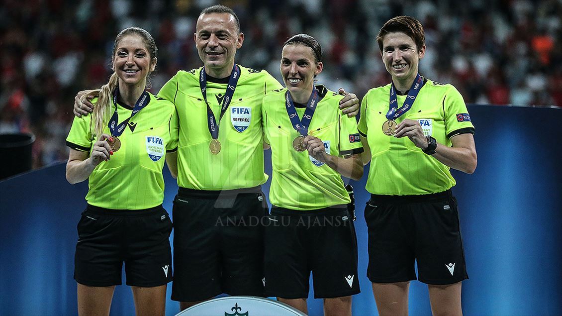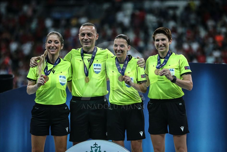 UEFA Süper Kupa maçında Liverpool ile Chelsea, Vodafone Park’ta karşılaştı. Maçın hakemleri Fransız Stephanie Frappart (sağ2), Manuela Nicolosi (solda), Michelle O'Neill (sağda) ve Cüneyt Çakır (sol2) karşılaşma sonrası fotoğraf çektirdi.