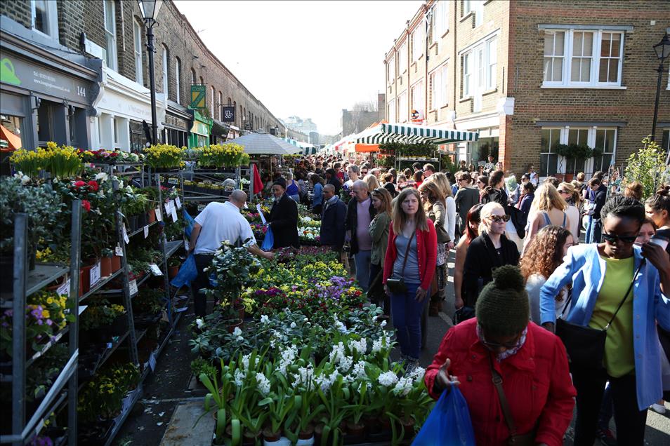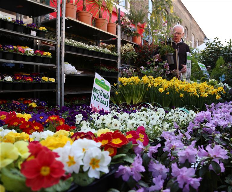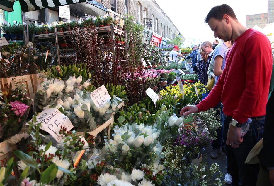 İngiltere'nin başkenti Londra'nın doğusunda bulunan ve yüzlerce çiçek ile bitkinin tezgahları süslediği "Columbia Caddesi Çiçek Pazarı", her hafta yoğun ilgi görüyor. 1869 yılından itibaren gıda pazarının kurulduğu ancak zamanla çiçek ve bitki pazarına evsahipliği yapmaya başlayan cadde, hafta sonunda güneşli havanın da etkisiyle ziyaretçi akınına uğradı. (Yunus Kaymaz - Anadolu Ajansı)Yunus Kaymaz