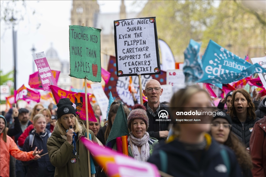 İngiltere ve Galler'de öğretmenler hükümetle süregelen maaş zammı anlaşmazlığı nedeniyle greve giderken, Londra'da binlerce öğretmen Başbakanlık Ofisi 10 Numara'nın bulunduğu Downing Sokağı'na yürüdü. Bazı protestocular yürüyüşe evcil hayvanlarıyla katıldı. ( Raşid Necati Aslım - Anadolu Ajansı )