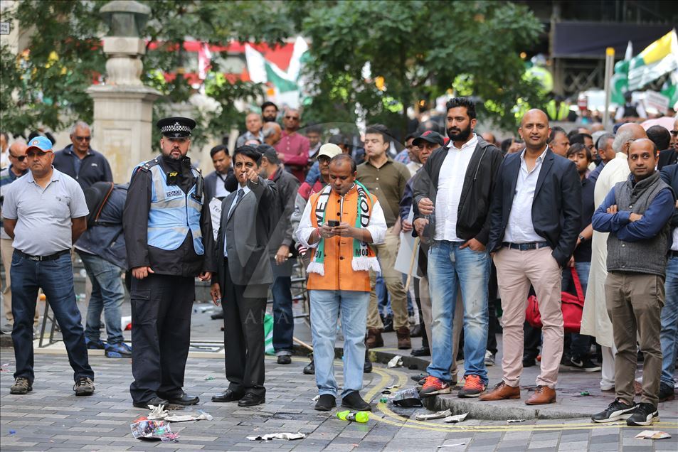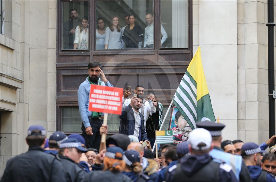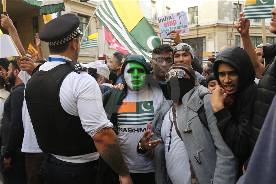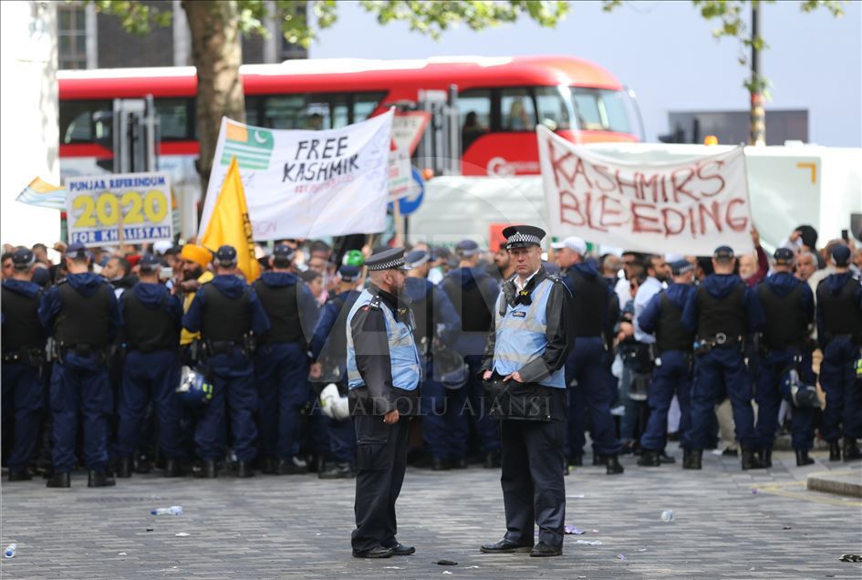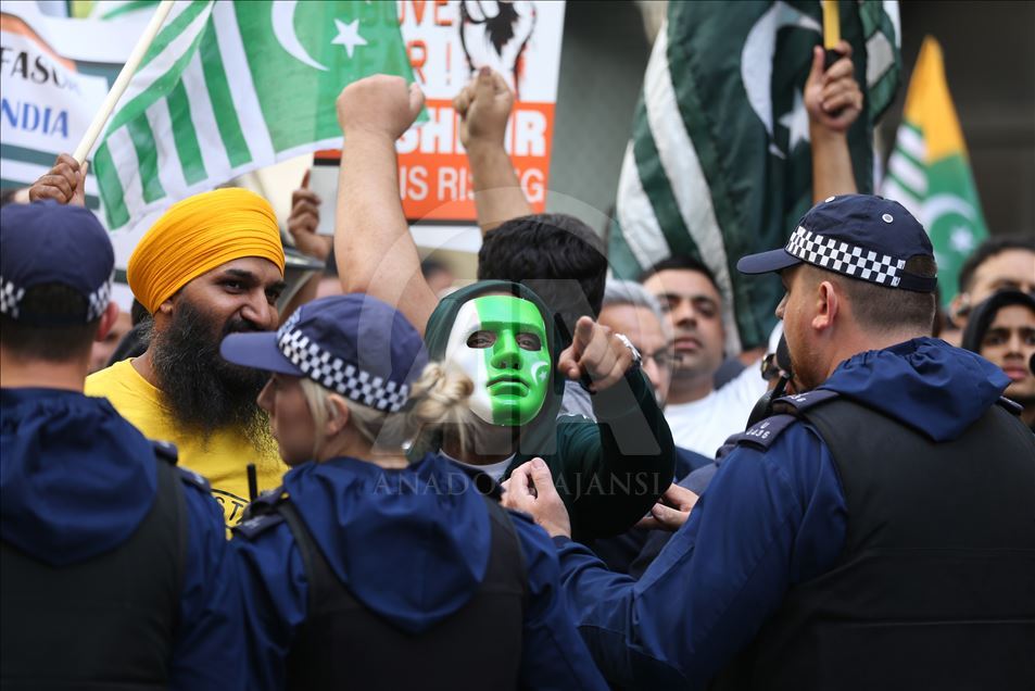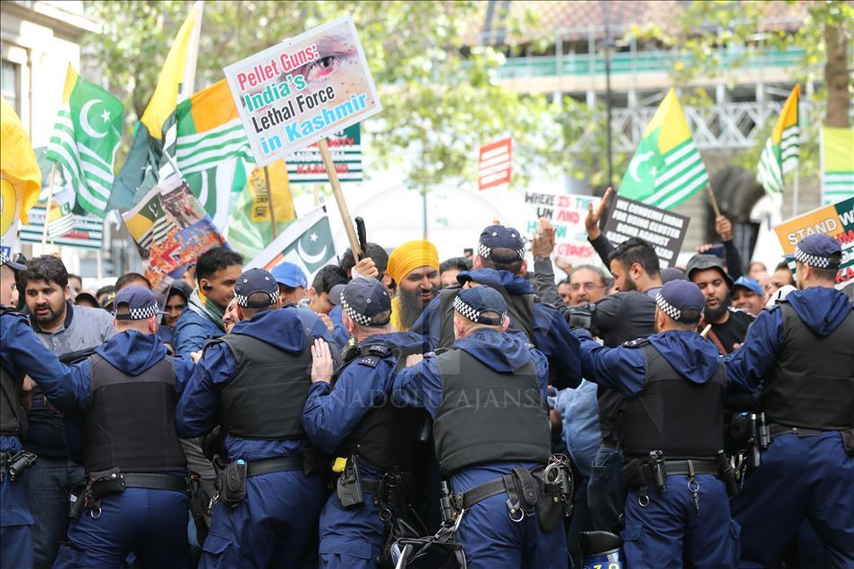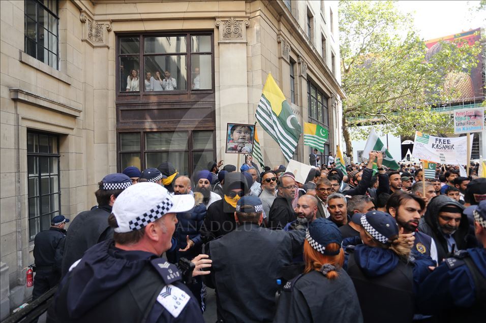 Hindistan'ın Cammu Keşmir'in özel statüsünü kaldırması İngiltere'nin başkenti Londra'da binlerce kişinin katıldığı gösteriyle protesto edildi. Hindistan Yüksek Komisyonu önünde toplanan binlerce gösterici ellerinde "Özgür Keşmir, Keşmir yanıyor, Hindistan ordusu Keşmir'den çık, Modi, savaş değil, çay yap" yazılı dövizler ile Pakistan ve Keşmir bayrakları taşıdı. Ana protesto alanına yakın bir noktada Hindistan yanlısı bir grup da toplandı. ( Isabel Infantes - Anadolu Ajansı )Isabel Infantes