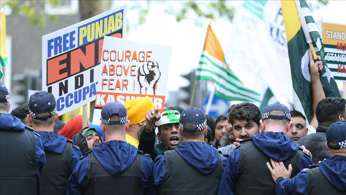 Hindistan'ın Cammu Keşmir'in özel statüsünü kaldırması İngiltere'nin başkenti Londra'daki Hindistan Yüksek Komisyonu önünde binlerce kişinin katıldığı gösteriyle protesto edildi. Ana protesto alanına yakın bir noktada Hindistan yanlısı bir grup da toplanırken, polis grupların karşı karşıya gelmemesi için tedbir aldı. ( Isabel Infantes - Anadolu Ajansı )Isabel Infantes