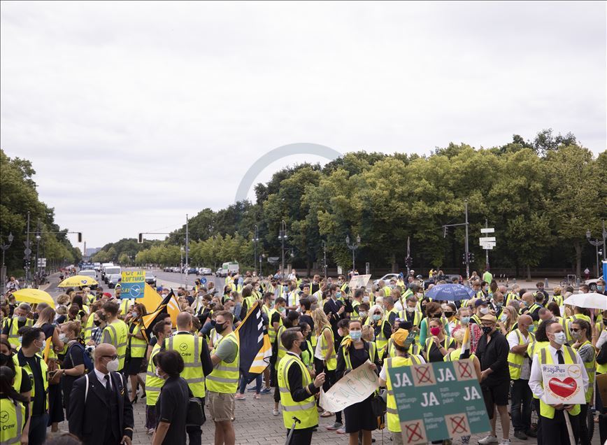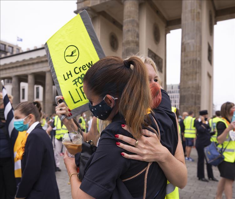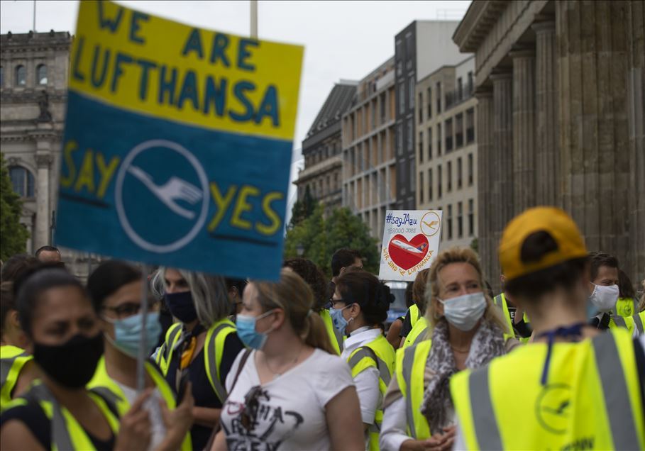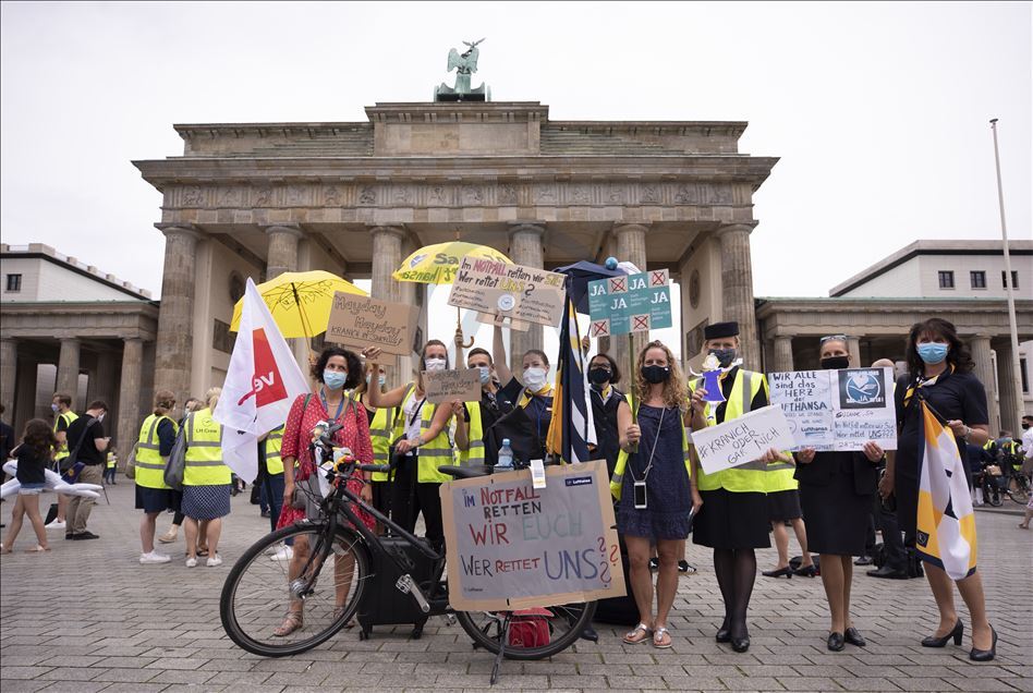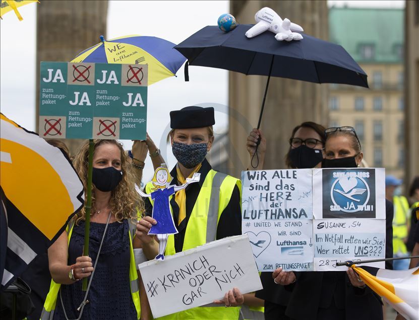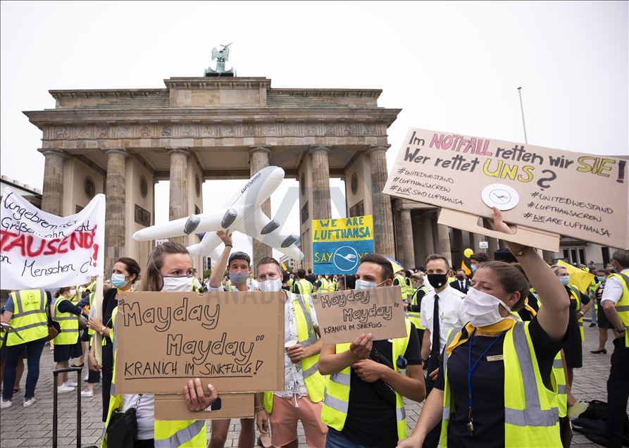 Alman hava yolu şirketi Lufthansa Grubu’nun çalışanları, hükümetin kurtarma paketinin kabul veya reddine karar verileceği yarınki olağanüstü genel kurul toplantısı öncesi ülkenin çeşitli şehirlerinde gösteri yaparak, hissedarlara "çalışanları düşünerek karar verme" çağrısı yaptı. Berlin’de tarihi Brandenburg Kapısı önünde toplanan yüzlerce Lufthansa çalışanı, şirket yönetimine ve hissedarlara söz konusu toplantıda federal hükümetin hazırladığı kurtarma paketini tartışırken kendilerini düşünmelerini talep etti. ( Abdulhamid Hoşbaş - Anadolu Ajansı )Abdulhamid Hoşbaş