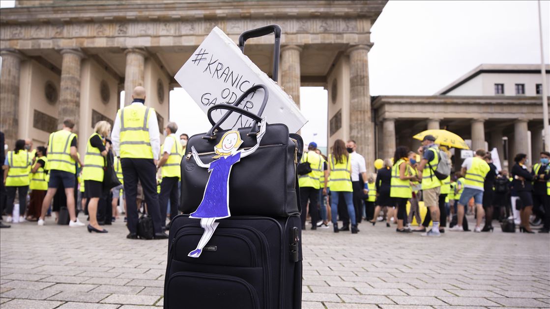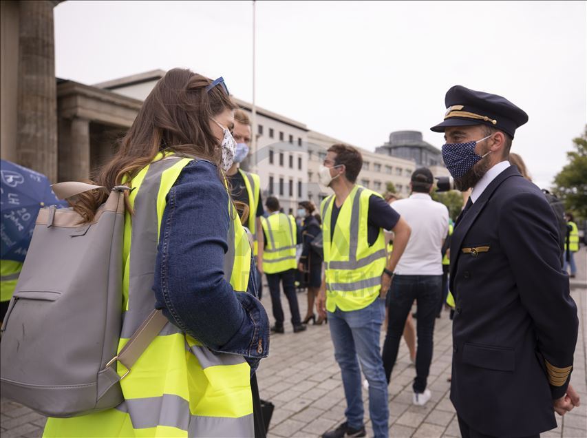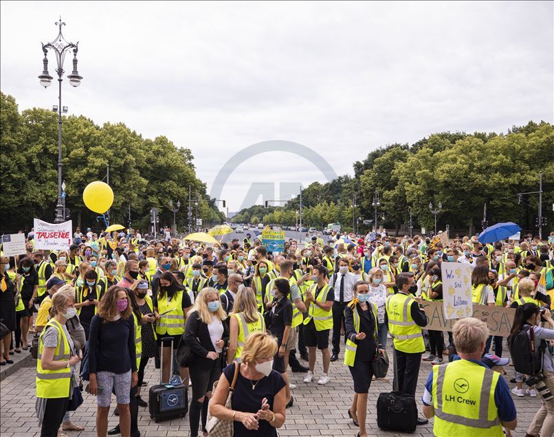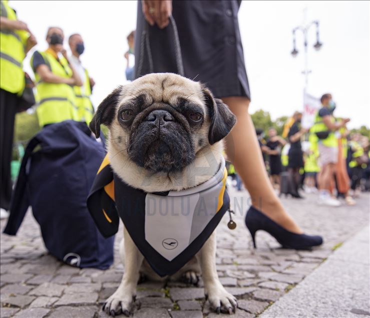 Alman hava yolu şirketi Lufthansa Grubu’nun çalışanları, hükümetin kurtarma paketinin kabul veya reddine karar verileceği yarınki olağanüstü genel kurul toplantısı öncesi ülkenin çeşitli şehirlerinde gösteri yaparak, hissedarlara "çalışanları düşünerek karar verme" çağrısı yaptı. Berlin’de tarihi Brandenburg Kapısı önünde toplanan yüzlerce Lufthansa çalışanı, şirket yönetimine ve hissedarlara söz konusu toplantıda federal hükümetin hazırladığı kurtarma paketini tartışırken kendilerini düşünmelerini talep etti. Bir Lufthansa çalışanı gösteriye köpeği ile katıldı. ( Abdulhamid Hoşbaş - Anadolu Ajansı )Abdulhamid Hoşbaş