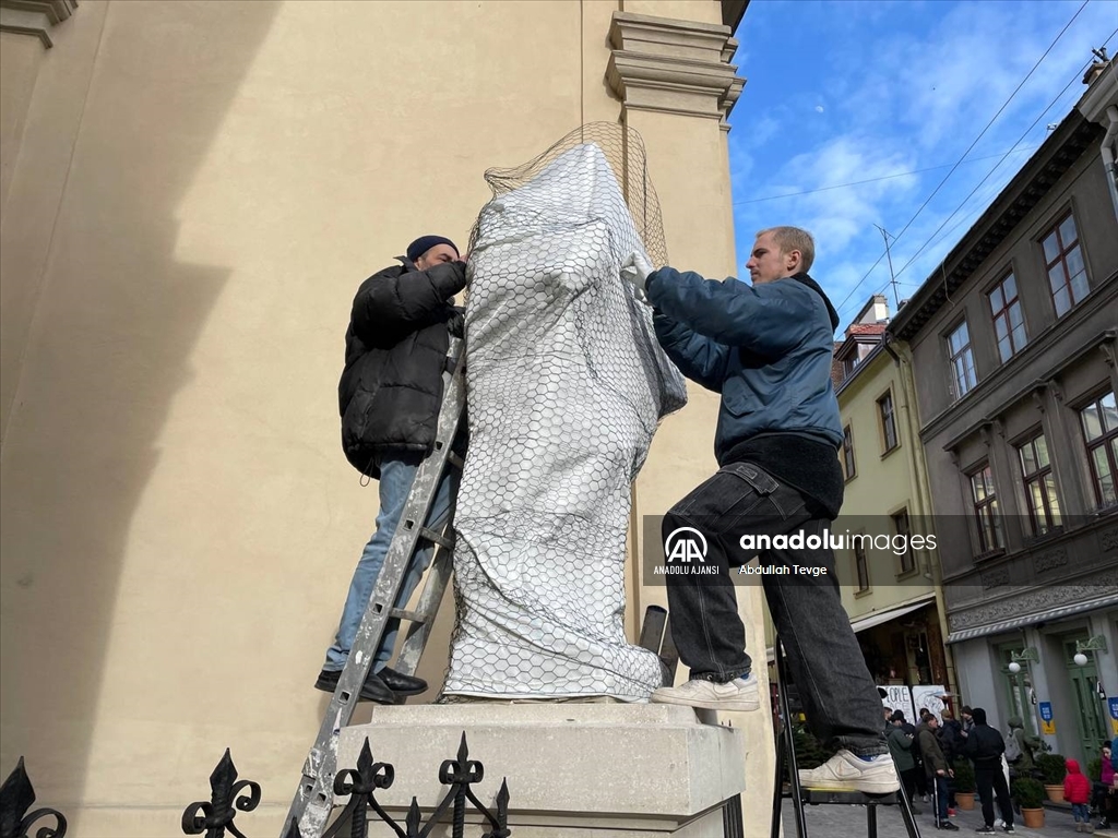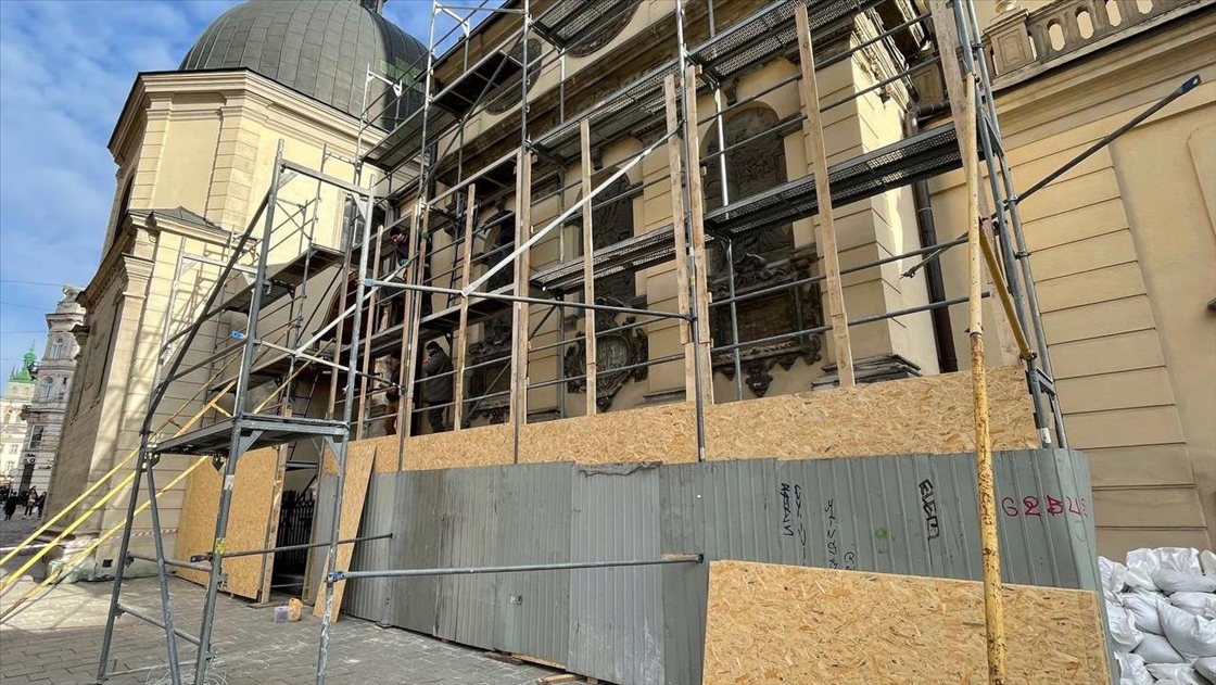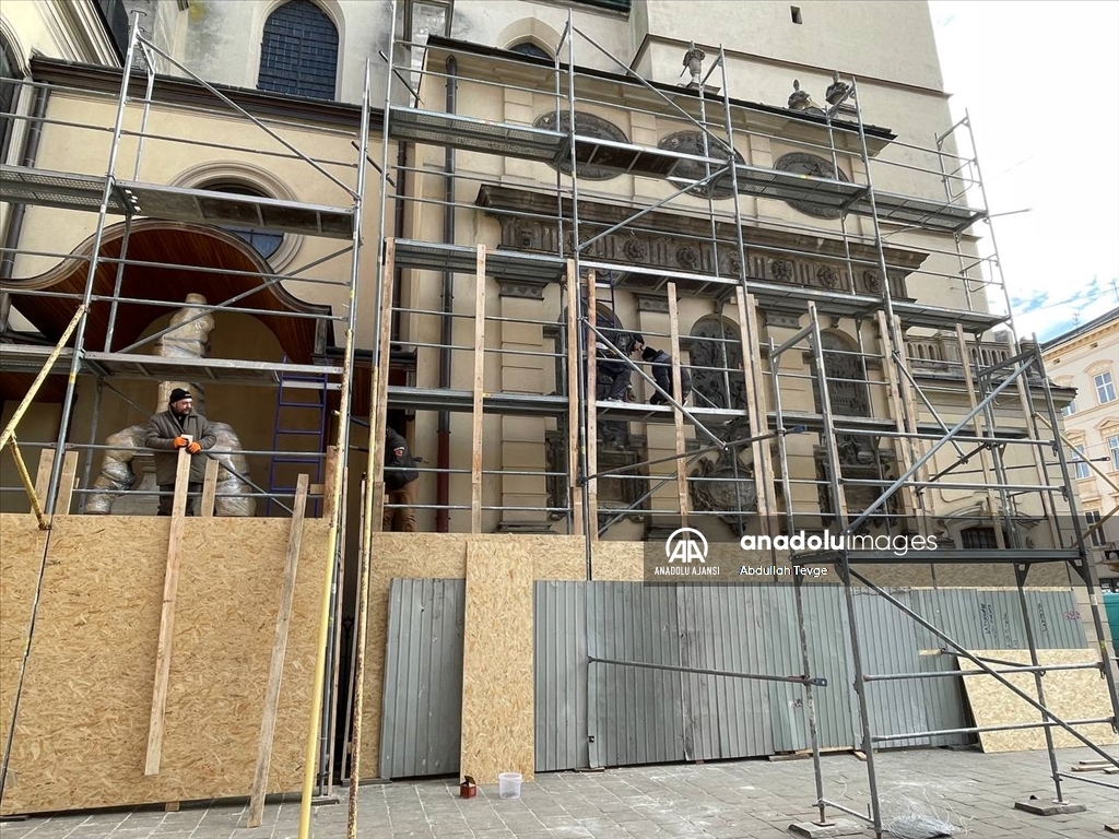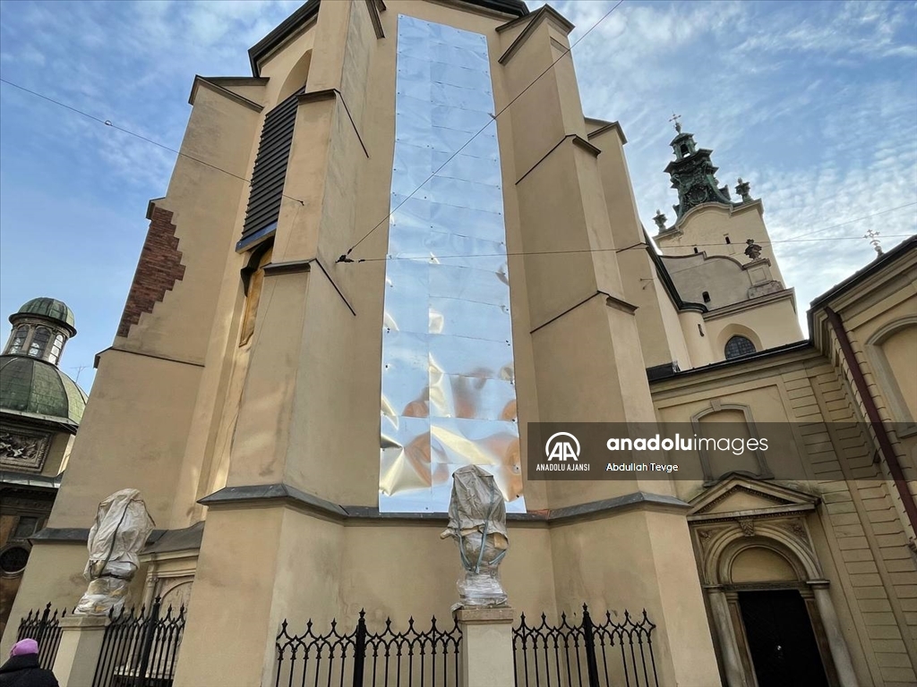 Rusya'nın Ukrayna'ya saldırıları sürerken, Lviv kentinde bulunan Latin Kilisesi’nin dış cephesi suntalarla kaplanarak saldırılara karşı korumaya alındı. Kilisenin çevresindeki heykellerin de üstü kapatıldı.