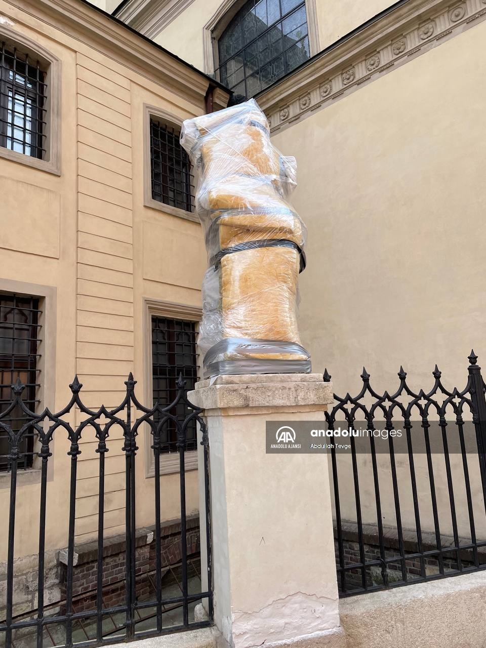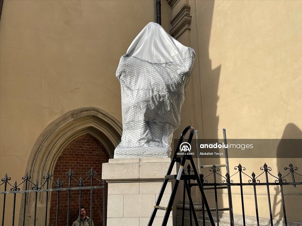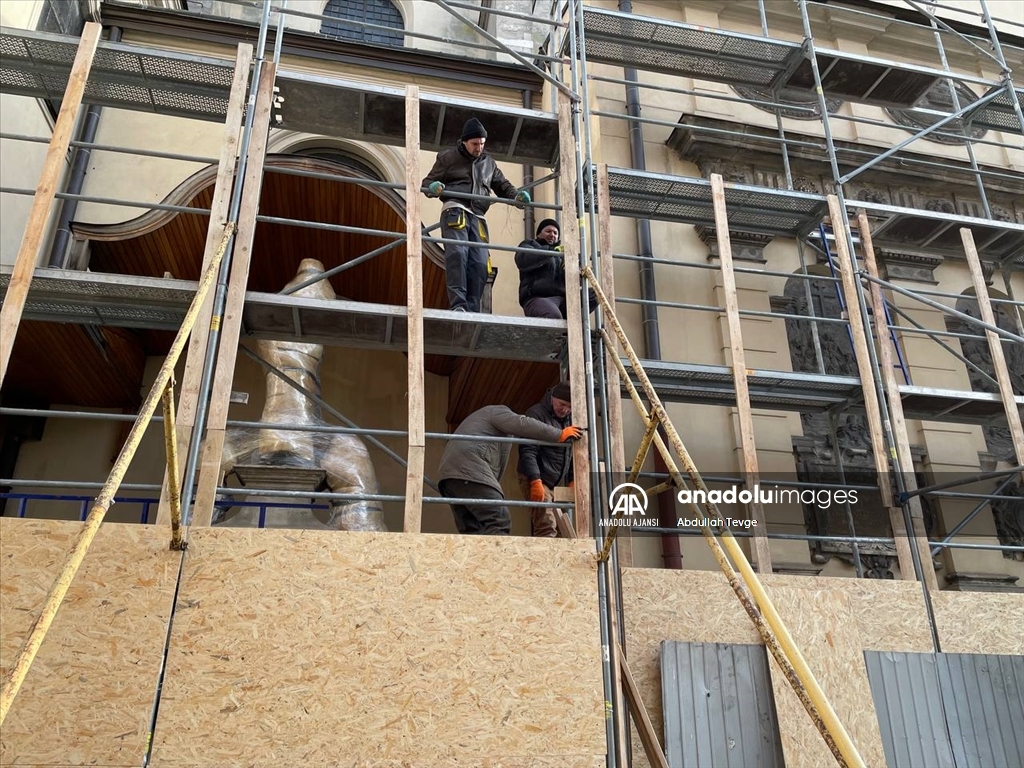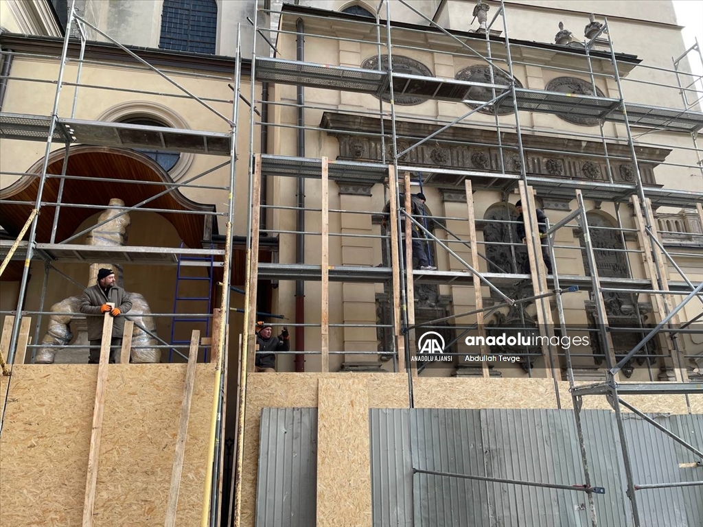 Rusya'nın Ukrayna'ya saldırıları sürerken, Lviv kentinde bulunan Latin Kilisesi’nin dış cephesi suntalarla kaplanarak saldırılara karşı korumaya alındı. Kilisenin çevresindeki heykellerin de üstü kapatıldı.