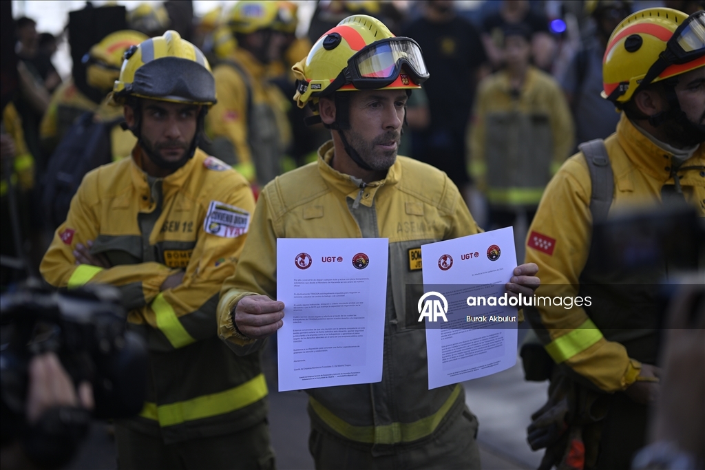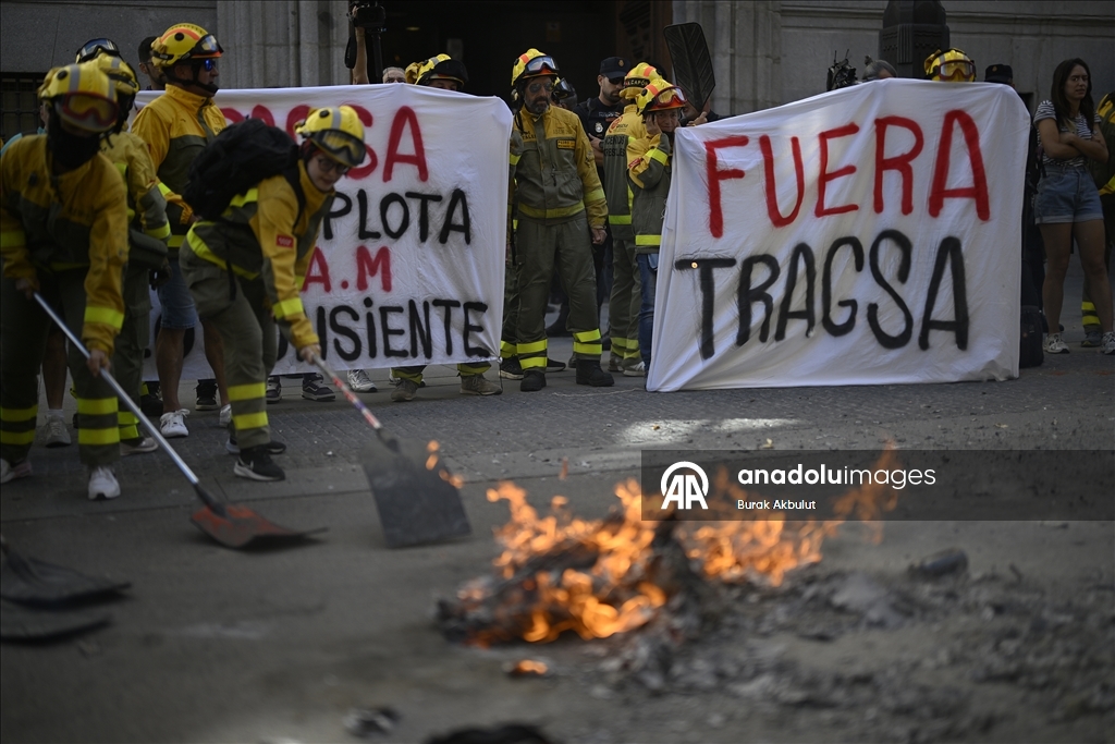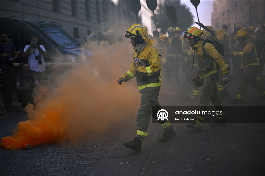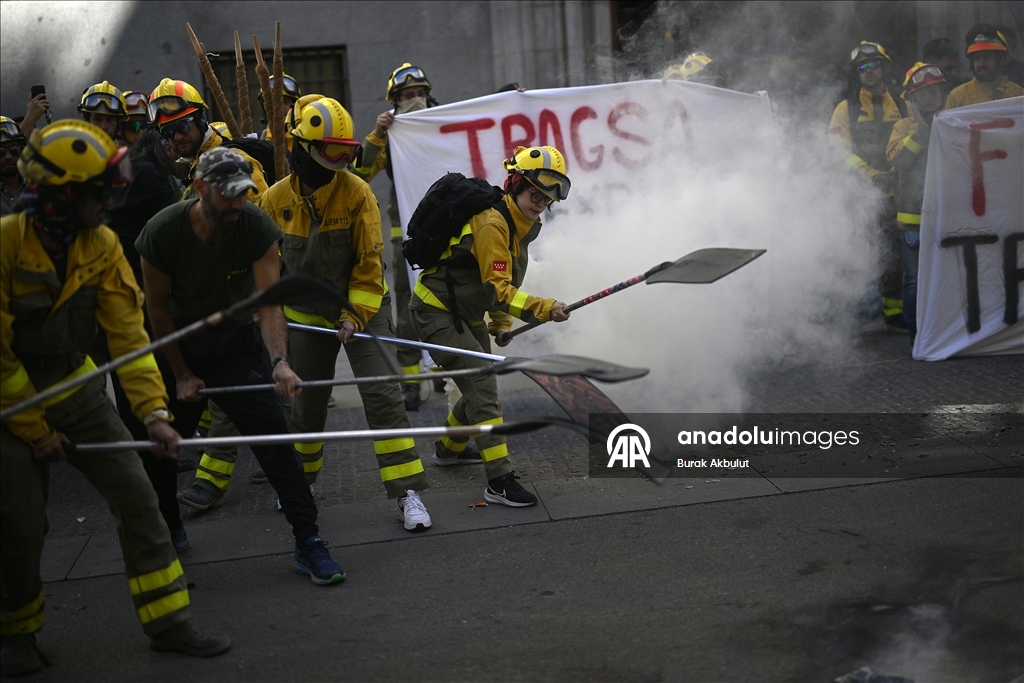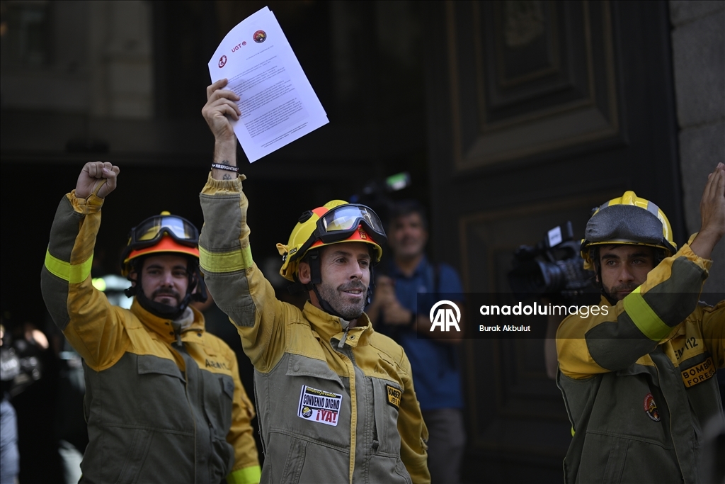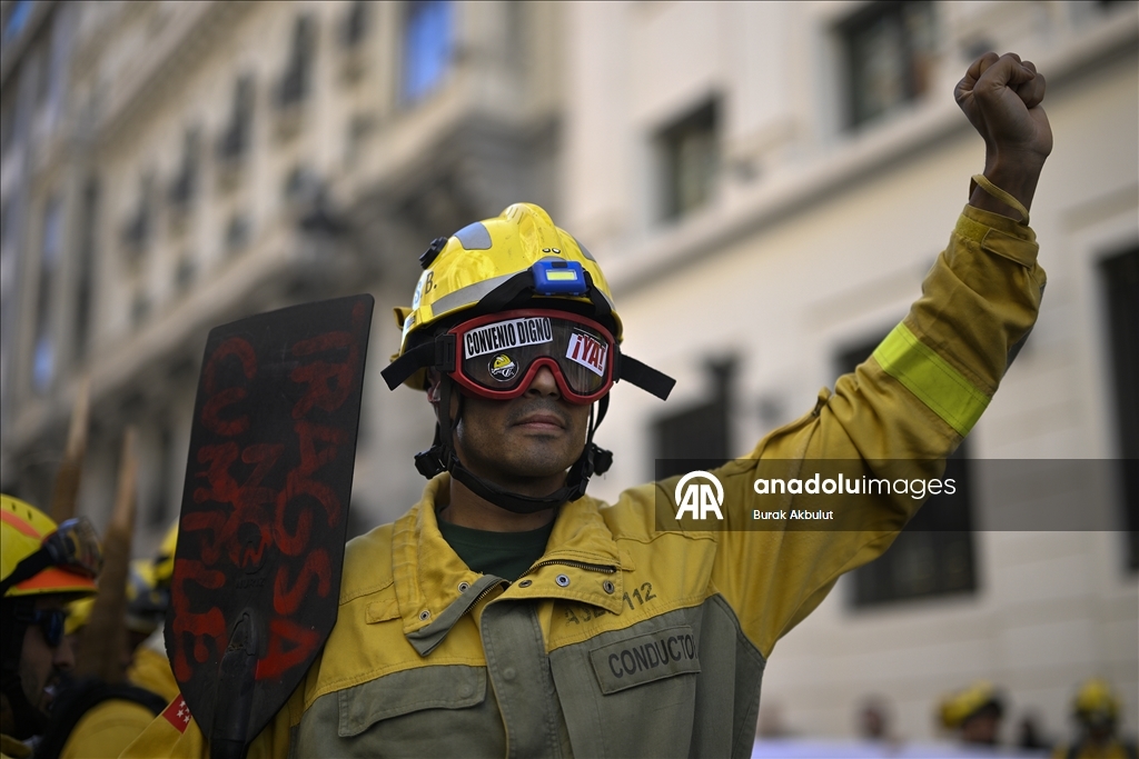 İspanya'nın başkenti Madrid'de süresiz grevde olan orman itfaiyecileri seslerini duyurmak için Maliye Bakanlığı binası önünde protesto düzenledi.
