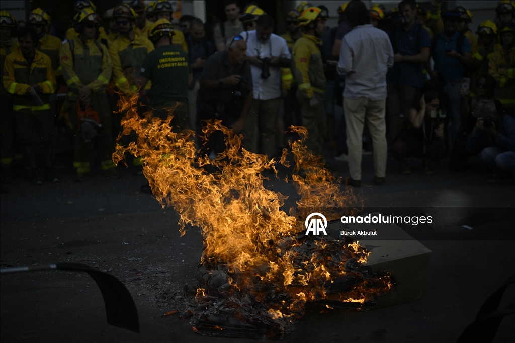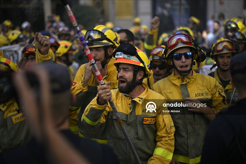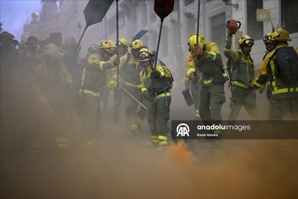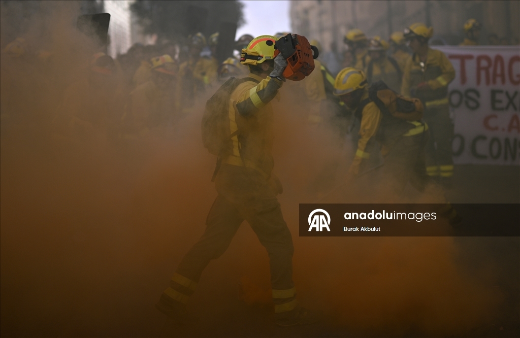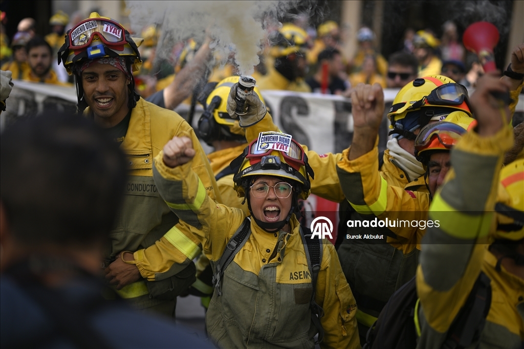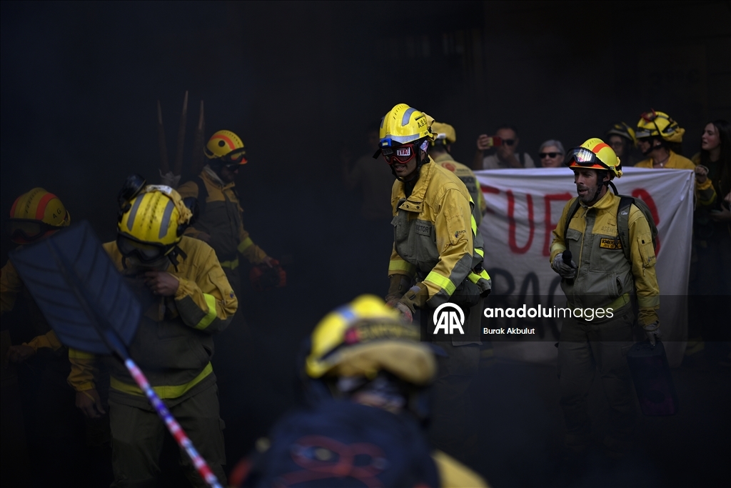 İspanya'nın başkenti Madrid'de süresiz grevde olan orman itfaiyecileri seslerini duyurmak için Maliye Bakanlığı binası önünde protesto düzenledi.