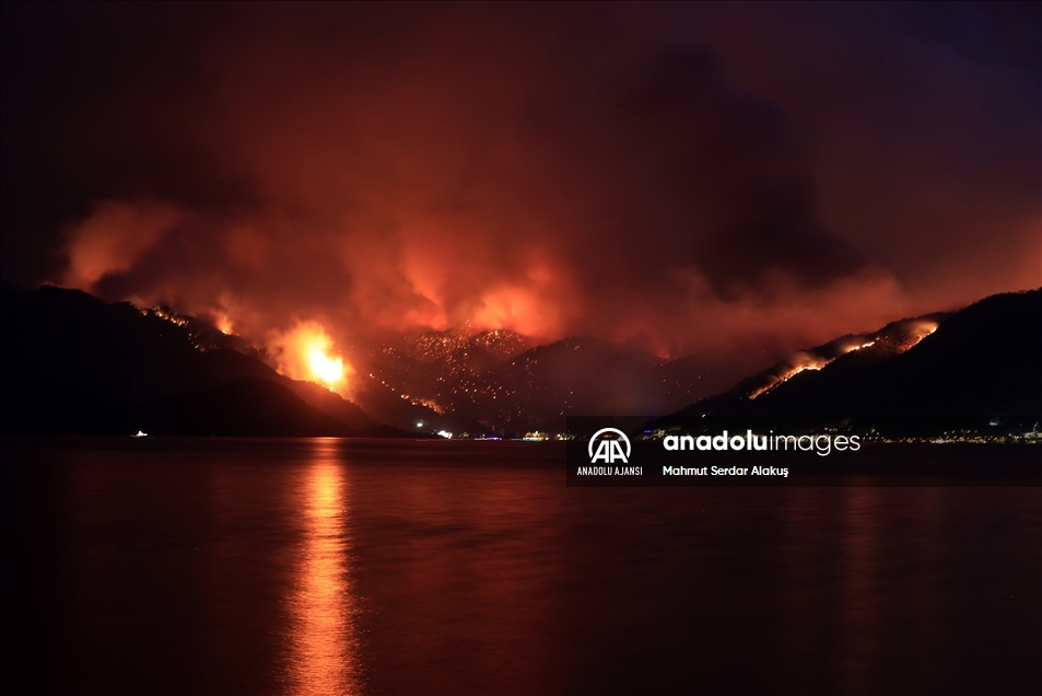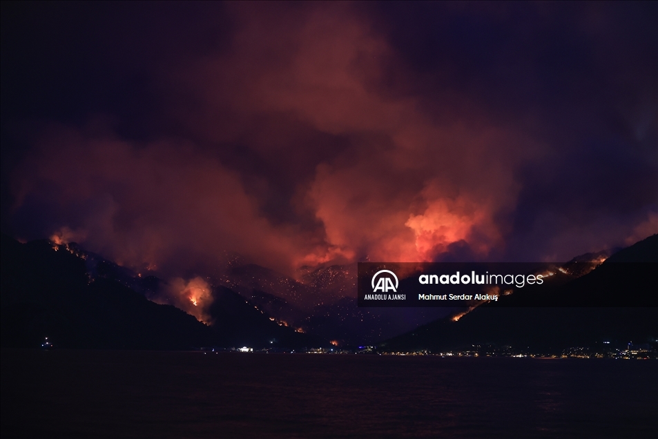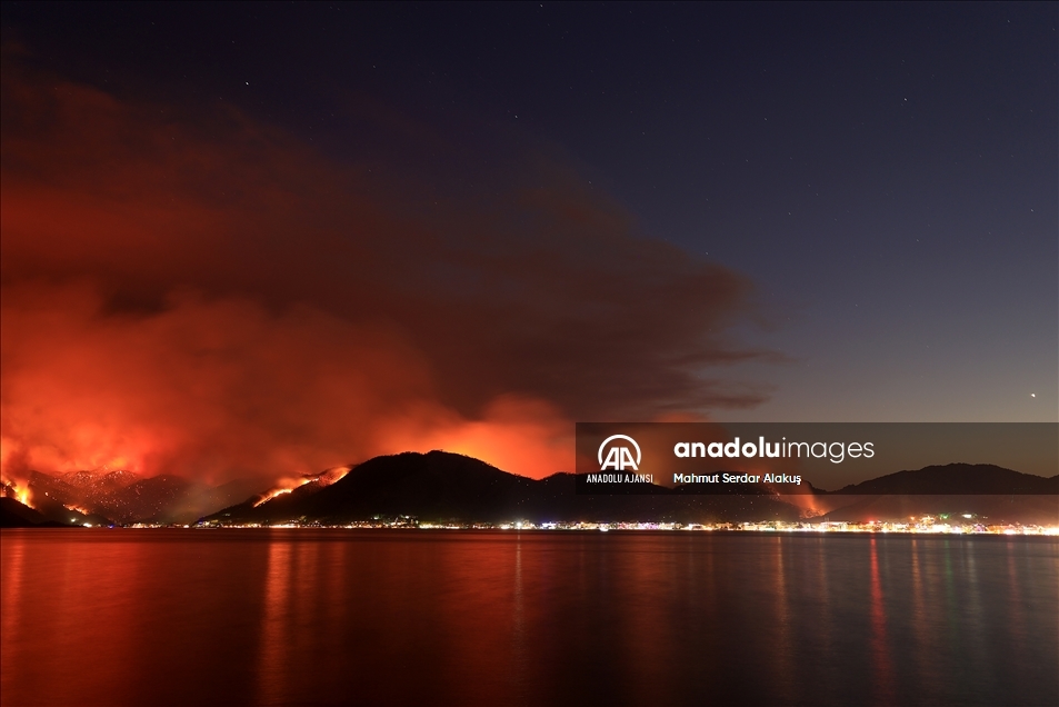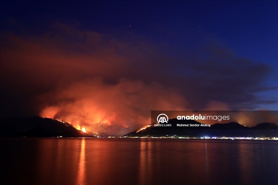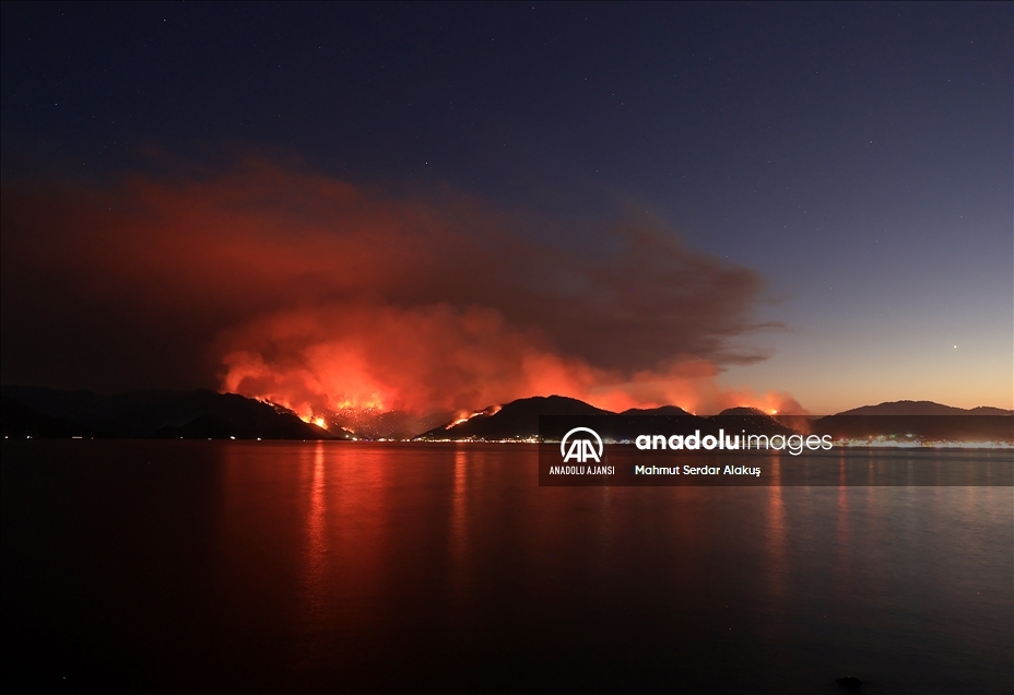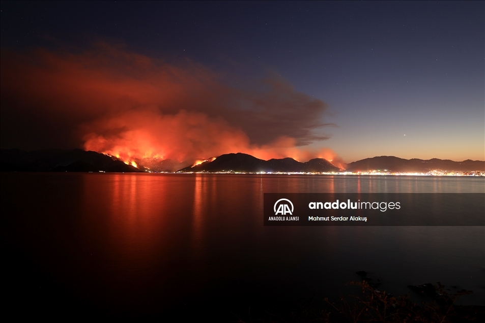 Muğla'nın Marmaris ilçesinde öğlen saatlerinde başlayan orman yangını devam ediyor. Marmaris'in Armutalan mahallesinde başlayan yangın İçmeler mahallesine doğru ilerliyor. Yangına Orman Bölge Müdürlüğü ekipleri, Muğla Büyükşehir Belediyesi ekipleri, emniyet güçleri ile Türk Silahlı Kuvvetleri mensupları müdahale ediyor. Yangın nedeniyle oluşan duman Gökova Körfezini kapladı. ( Mahmut Serdar Alakuş - Anadolu Ajansı )Mahmut Serdar Alakuş