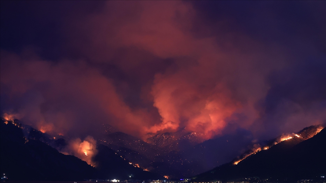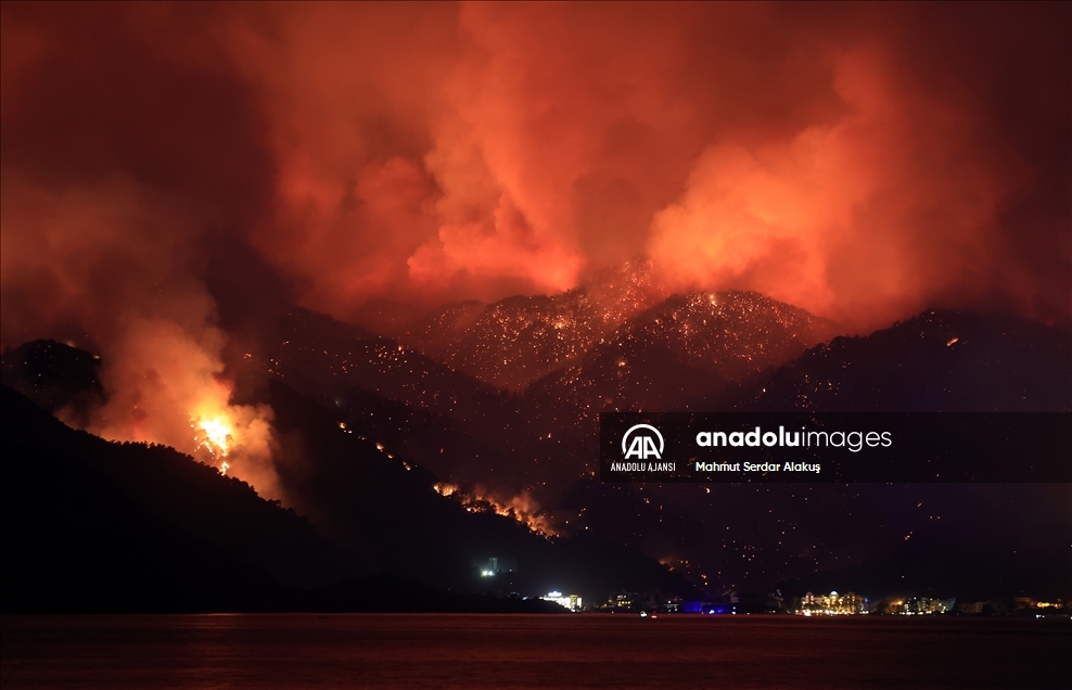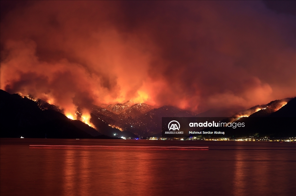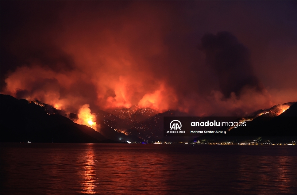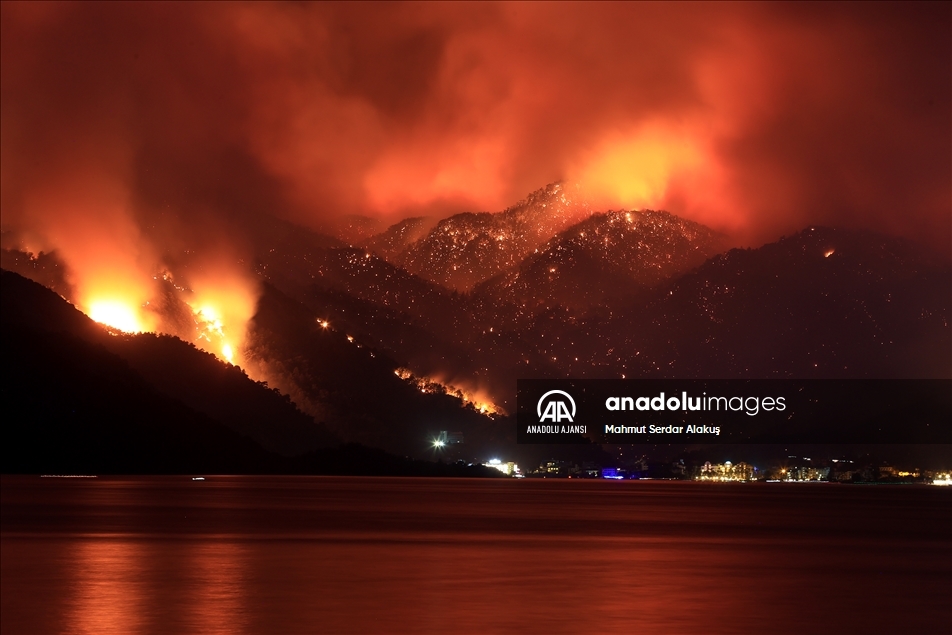 Muğla'nın Marmaris ilçesinde öğlen saatlerinde başlayan orman yangını devam ediyor. Marmaris'in Armutalan mahallesinde başlayan yangın İçmeler mahallesine doğru ilerliyor. Yangına Orman Bölge Müdürlüğü ekipleri, Muğla Büyükşehir Belediyesi ekipleri, emniyet güçleri ile Türk Silahlı Kuvvetleri mensupları müdahale ediyor. Yangın nedeniyle oluşan duman Gökova Körfezini kapladı. ( Mahmut Serdar Alakuş - Anadolu Ajansı )Mahmut Serdar Alakuş