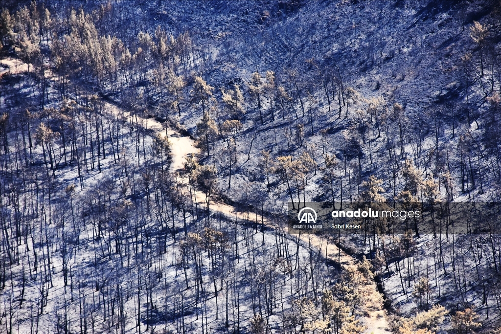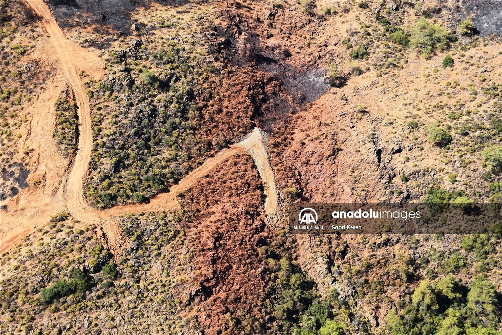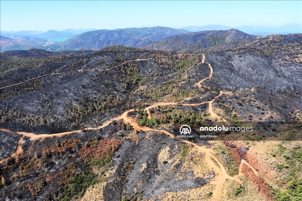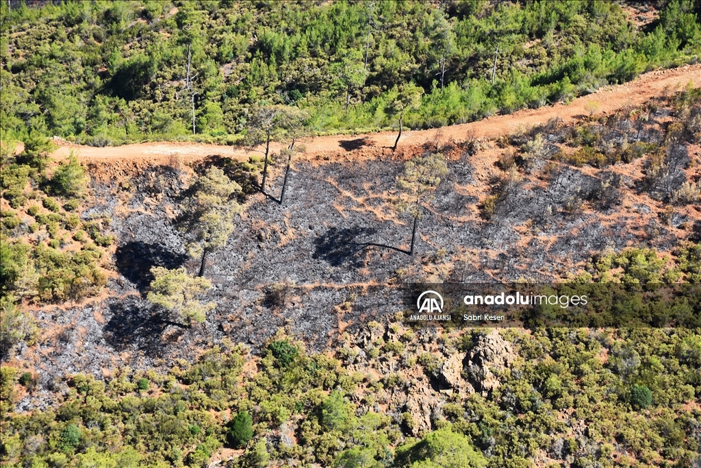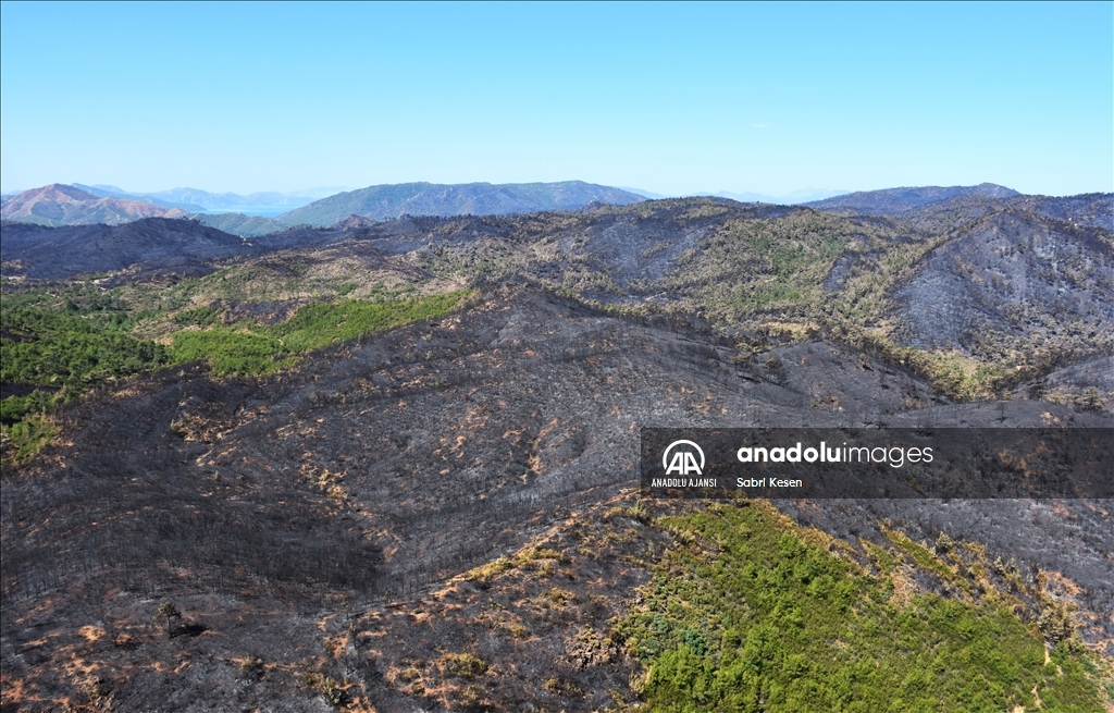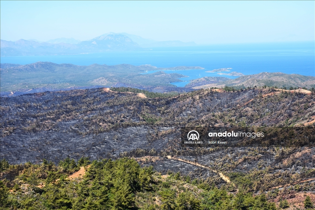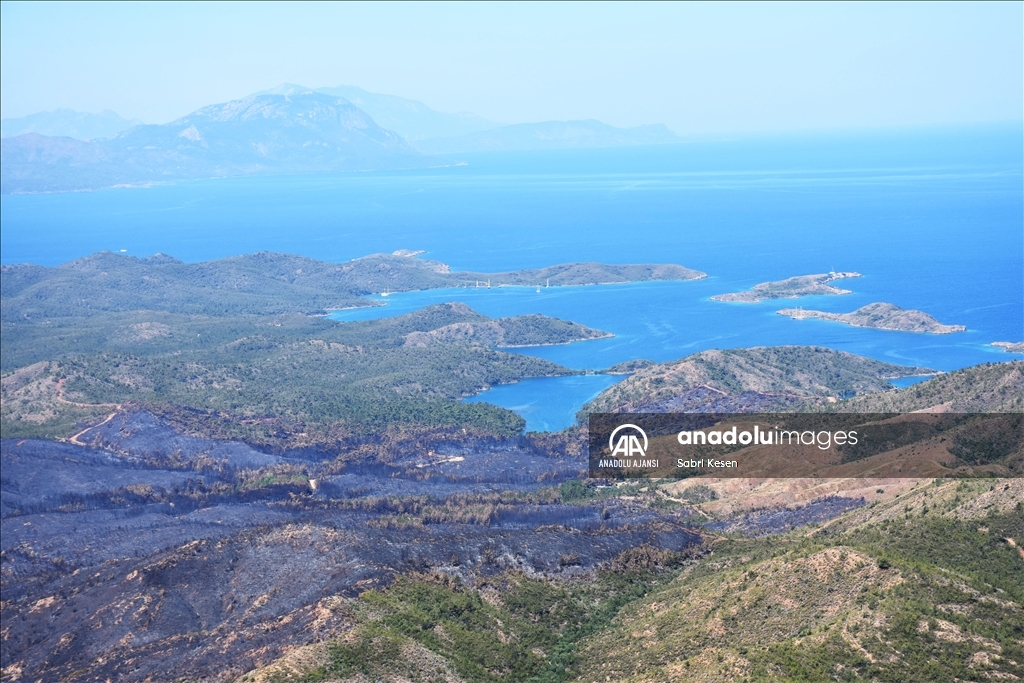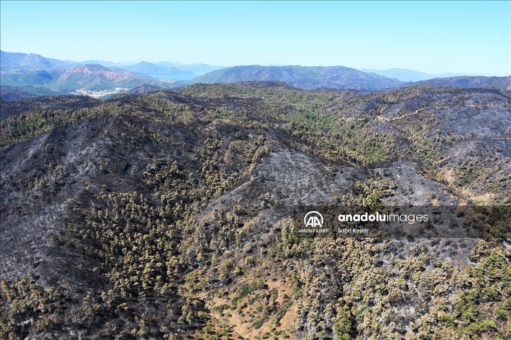 Marmaris ilçesinde 21 Haziran'da başlayan ve kontrol altına alınan orman yangınının bıraktığı izler helikopterle havadan görüntülendi.