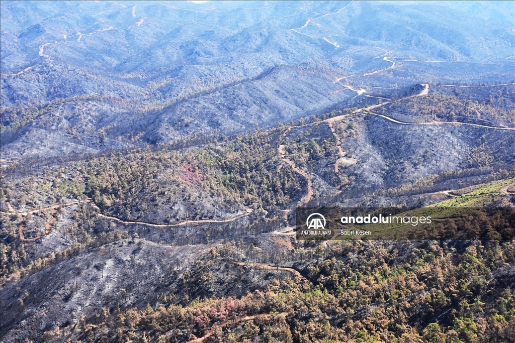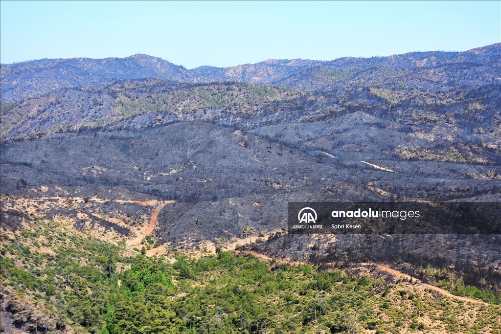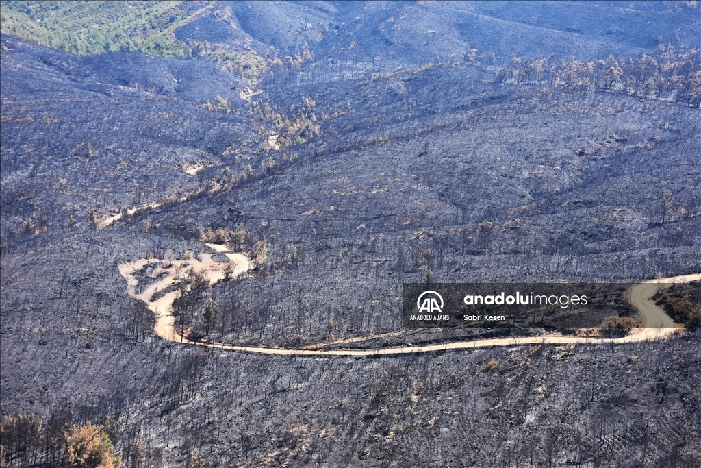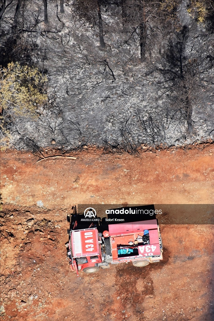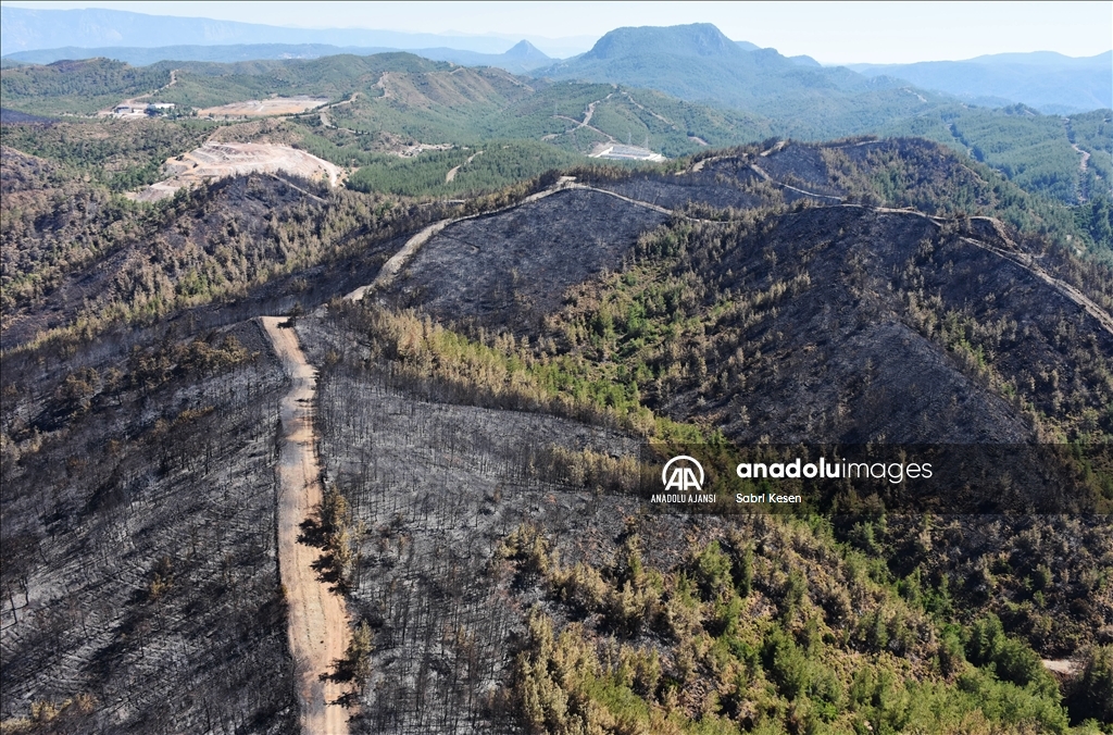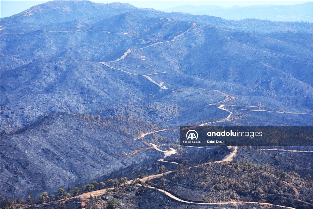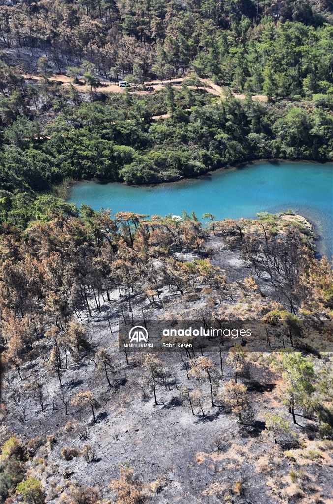 Marmaris ilçesinde 21 Haziran'da başlayan ve kontrol altına alınan orman yangınının bıraktığı izler helikopterle havadan görüntülendi.