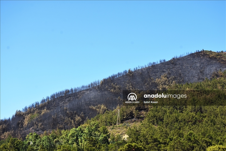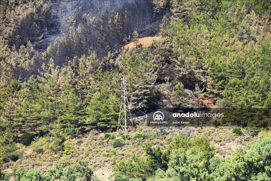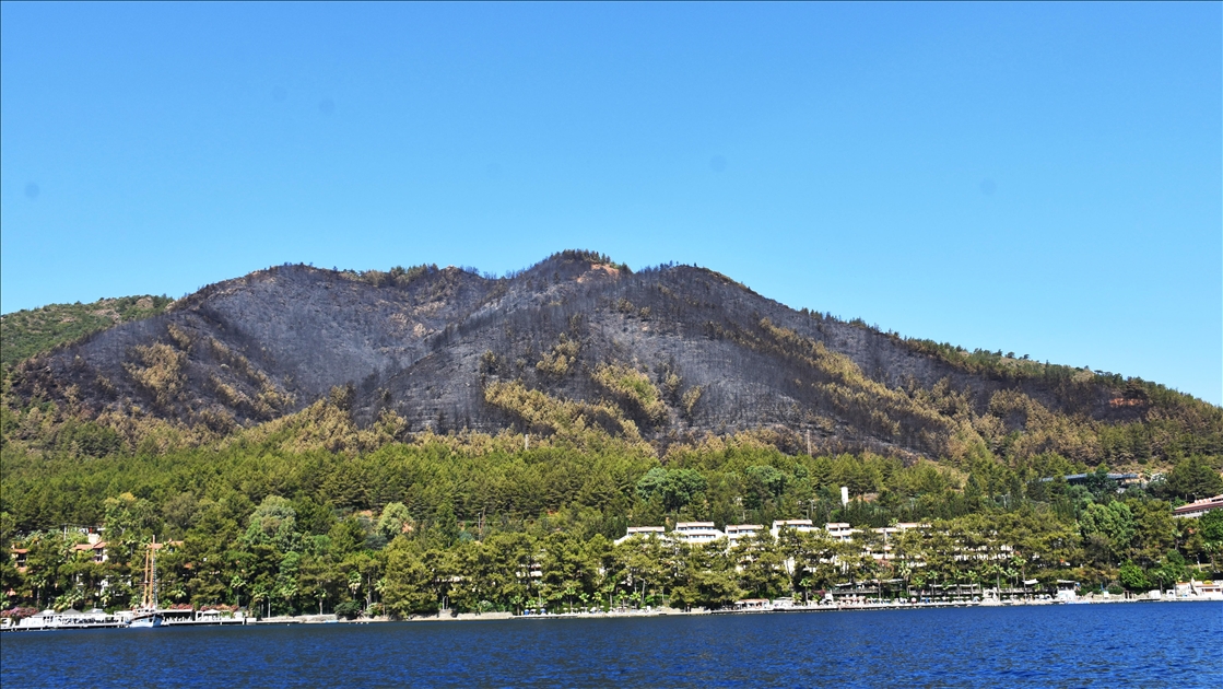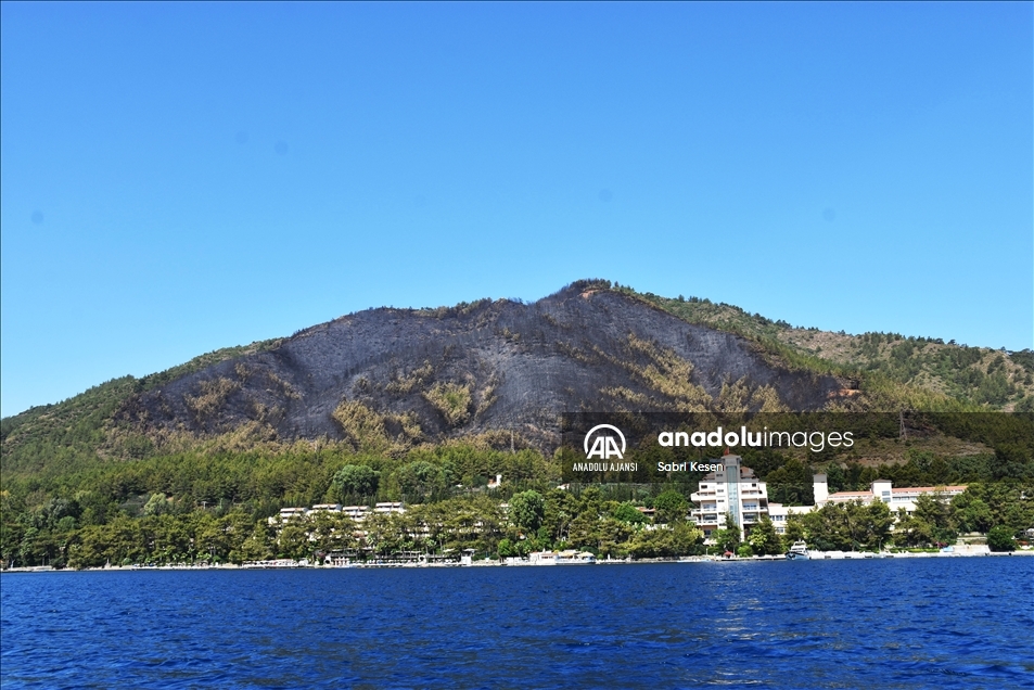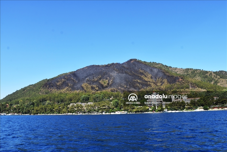Muğla'nın Marmaris ilçesinde otellere yakın ormanlık bölgede çıkan yangınında zarar gören alan, denizden görüntülendi. Güney Ege'nin gözde turizm merkezi Marmaris'in İçmeler Mahallesi'ndeki ormanlık alandaki yangın, ekiplerin bölgede gece boyunca sürdürdüğü soğutma çalışmalarını tamamlamasının ardından günün ağarmasıyla alevlerin neden olduğu tahribatın boyutu da gözler önüne serildi.