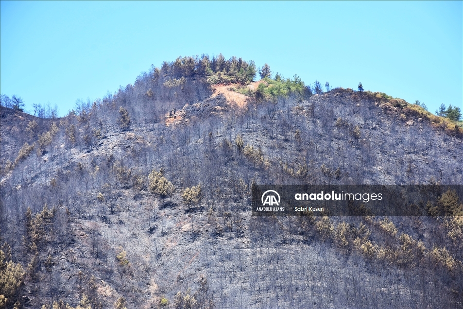 Muğla'nın Marmaris ilçesinde otellere yakın ormanlık bölgede çıkan yangınında zarar gören alan, denizden görüntülendi. Güney Ege'nin gözde turizm merkezi Marmaris'in İçmeler Mahallesi'ndeki ormanlık alandaki yangın, ekiplerin bölgede gece boyunca sürdürdüğü soğutma çalışmalarını tamamlamasının ardından günün ağarmasıyla alevlerin neden olduğu tahribatın boyutu da gözler önüne serildi. ( Sabri Kesen - Anadolu Ajansı )Sabri Kesen
