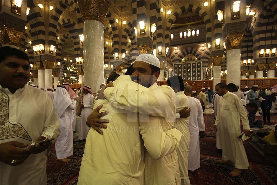 Suudi Arabistan'ın, Medine kentindeki Müslümanlar, Ramazan Bayramı namazını kılmak için Hazreti Muhammed'in kabrinin de bulunduğu Mescid-i Nebevi'ye geldi. Vatandaşlar, kılınan bayram namazının ardından birbirleriyle bayramlaştı. ( Faisal Khan - Anadolu Ajansı )Faisal Khan