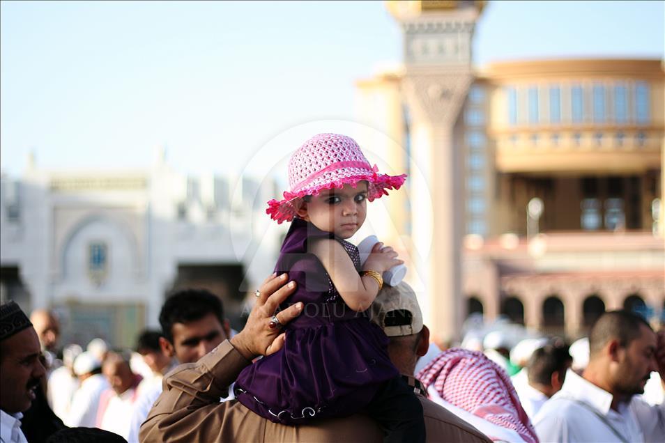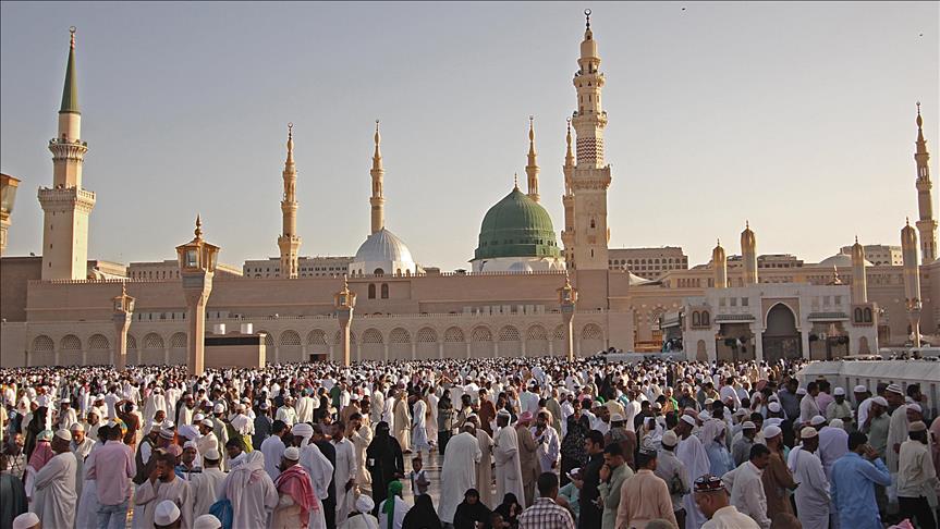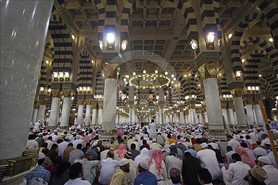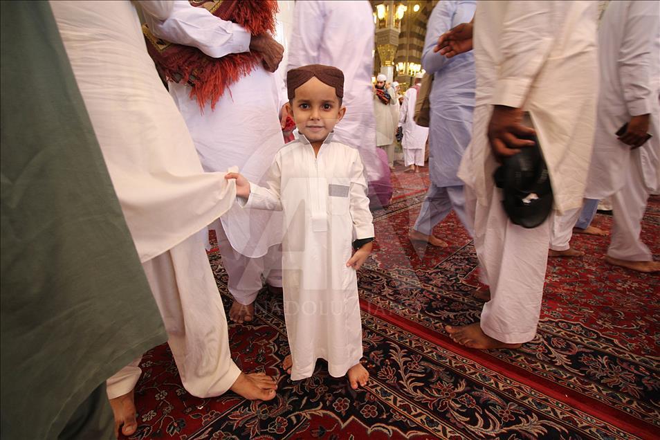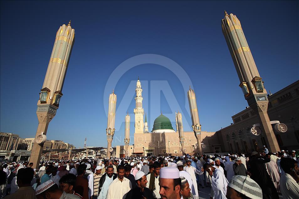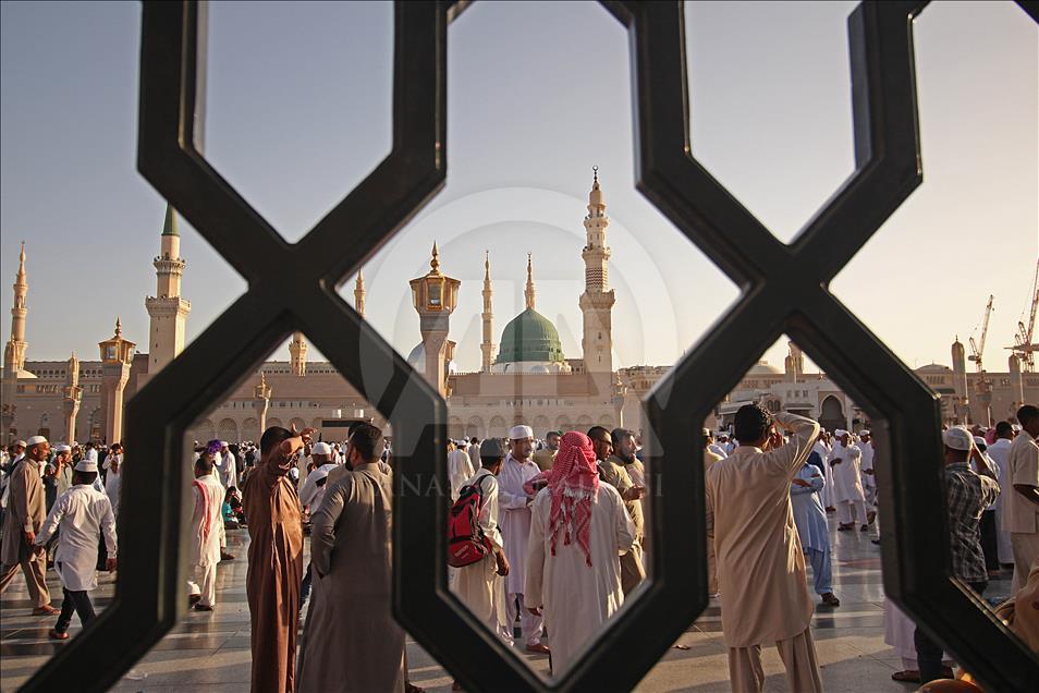 Suudi Arabistan'ın, Medine kentindeki Müslümanlar, Ramazan Bayramı namazını kılmak için Hazreti Muhammed'in kabrinin de bulunduğu Mescid-i Nebevi'ye geldi.