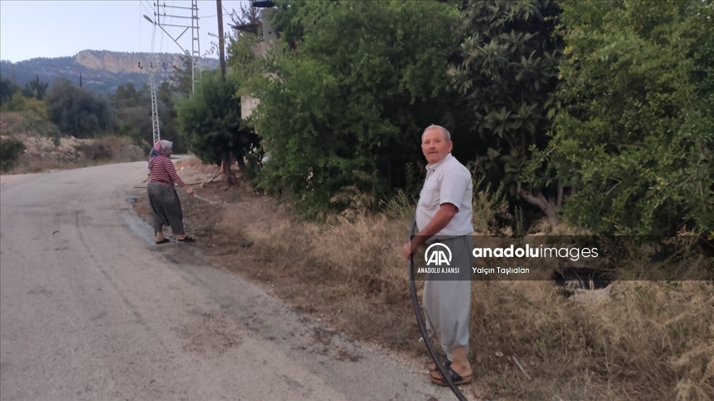 Gülnar ilçesinde çıkan orman yangınına havadan ve karadan müdahale ediliyor. Bazı vatandaşlar önlem amaçlı kendi bahçelerinin bulunduğu alandaki kuru otları suladı. ( Yalçın Taşlıalan - Anadolu Ajansı )Yalçın Taşlıalan