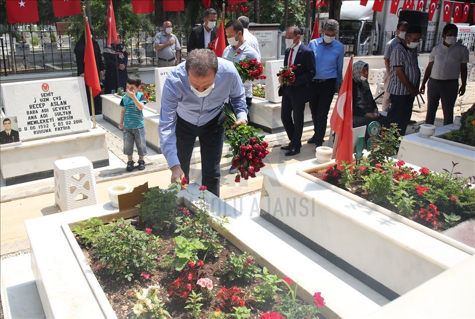 Mersin'de 'Babalar Günü dolayısıyla şehit ailelerinin mezarlık ziyaretlerinde duygusal anlar yaşandı. Şehit aileleri Akbelen Mezarlığı'ndaki şehitliğe gelerek kabirlerin temizliğini yaptı. Kabirlere diktikleri çiçekleri sulayan aileler, Babalar Günü'nde gözyaşı döktü. Mersin'de 'Babalar Günü dolayısıyla şehit ailelerinin mezarlık ziyaretlerinde duygusal anlar yaşandı. Büyükşehir Belediye Başkanı Vahap Seçer ve beraberindekiler şehit mezarlarına karanfil bıraktı.