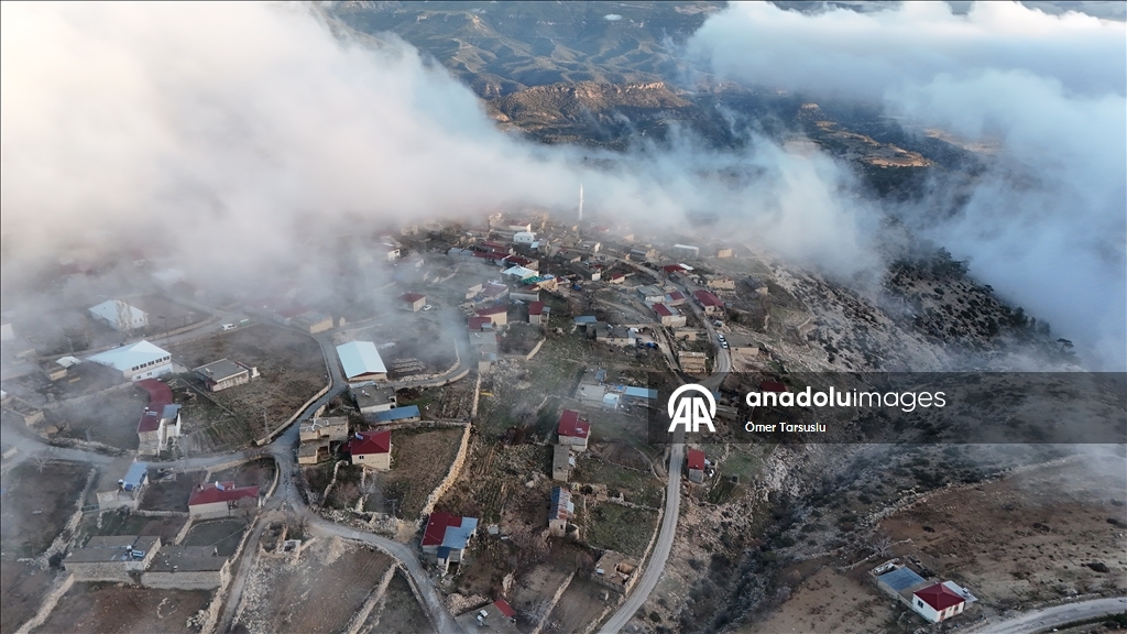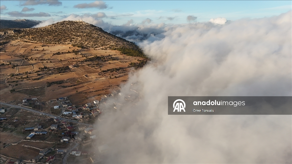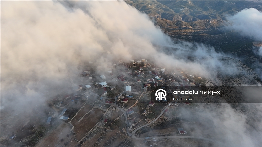 İlçede etkili olan sis bulutu, 1200 rakımdaki Hacıahmetli Mahallesi'nin yüksek kesimlerini kapladı.