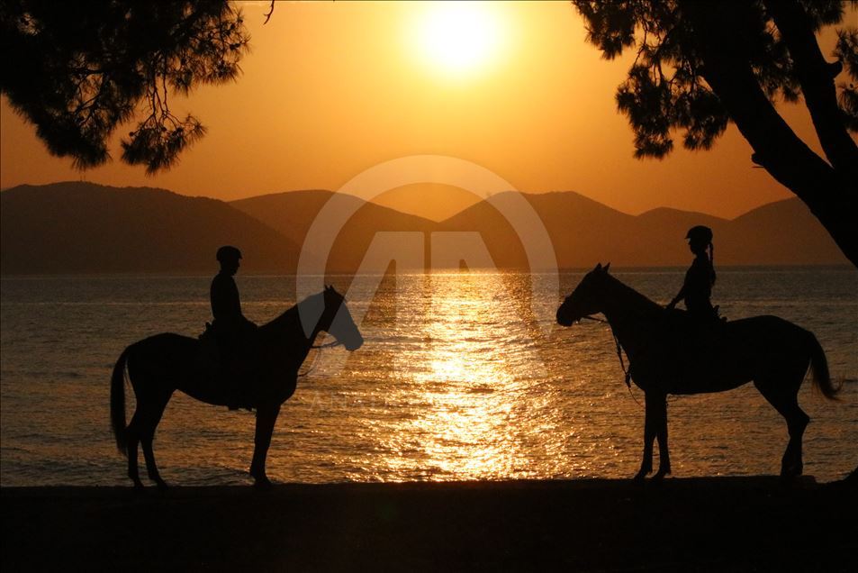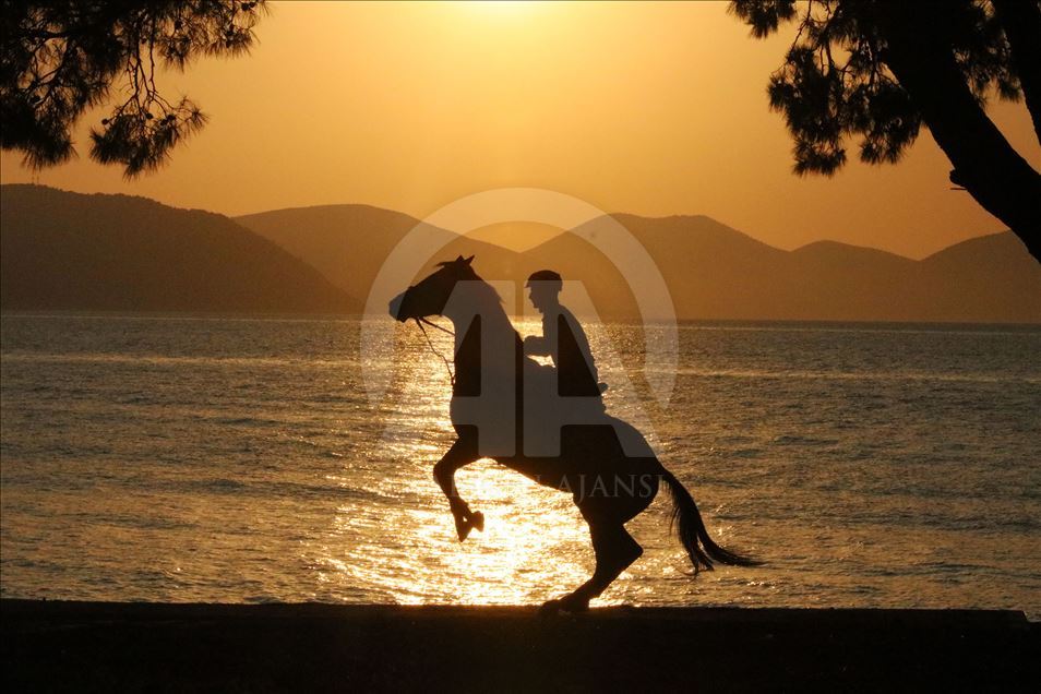 Nevşehir Jandarma At ve Köpek Eğitim Merkezi Komutanlığından getirilen "Başak", "Ayperi" ve "Ülkem" isimli atlar, Aydın'ın Kuşadası ilçesinde göreve başladı. Atlı timlerin gün batımındaki anları ise güzel görüntü oluşturdu. ( Ferdi Uzun - Anadolu Ajansı )Ferdi Uzun