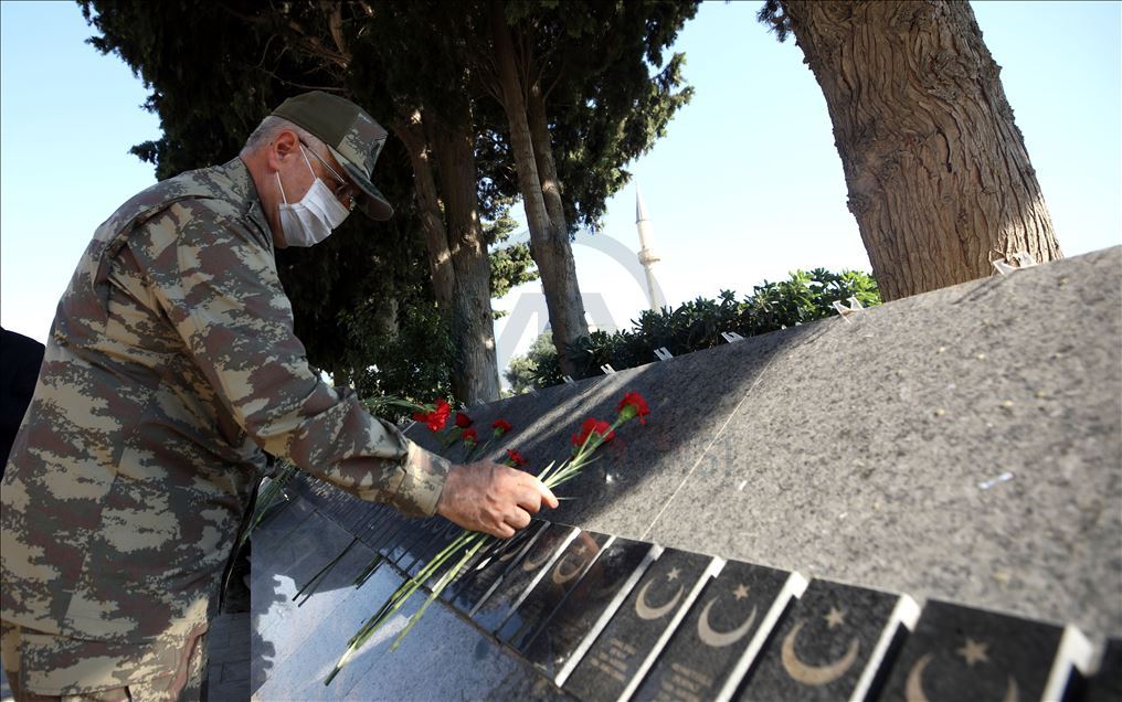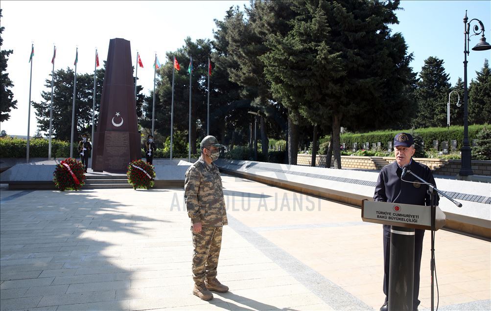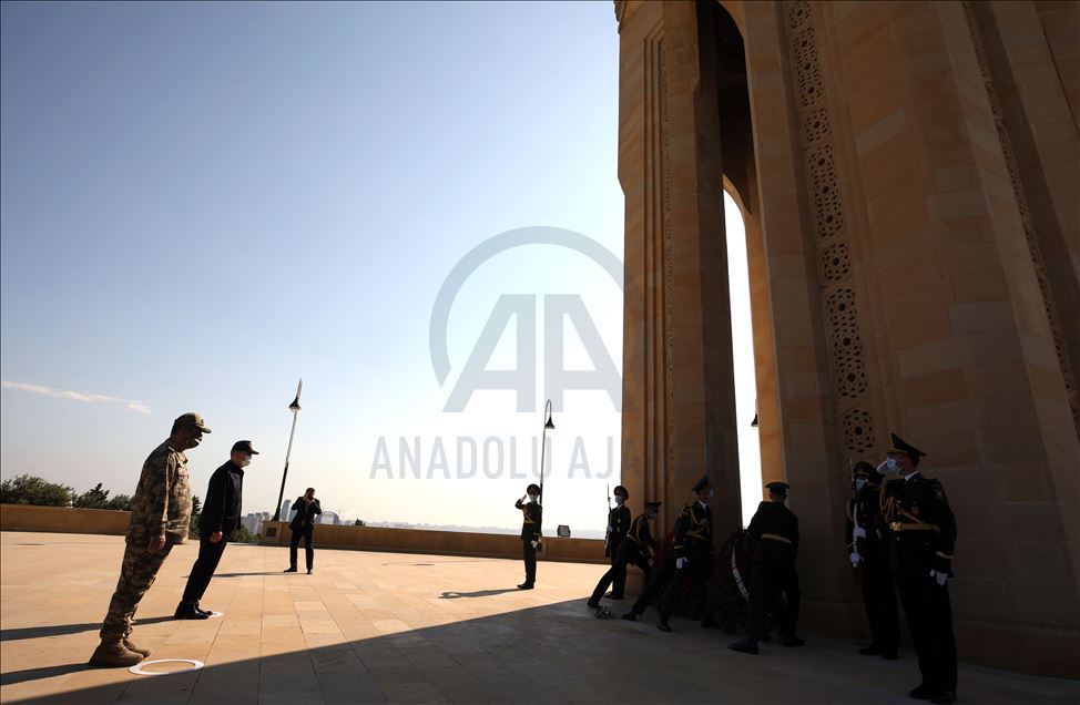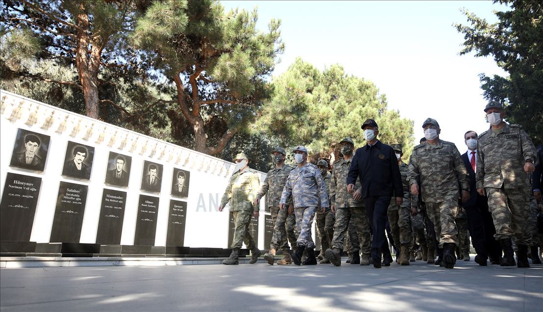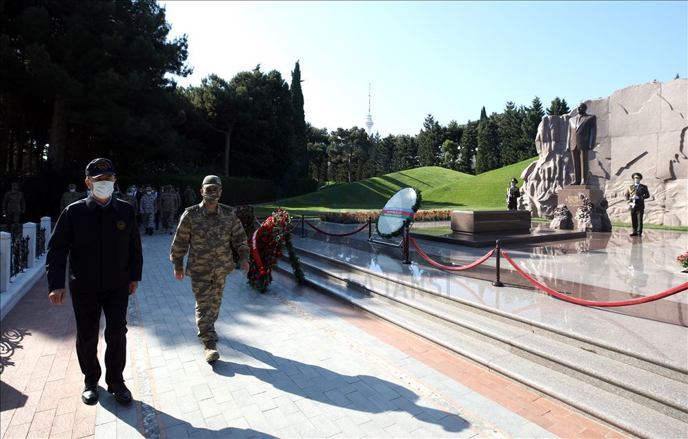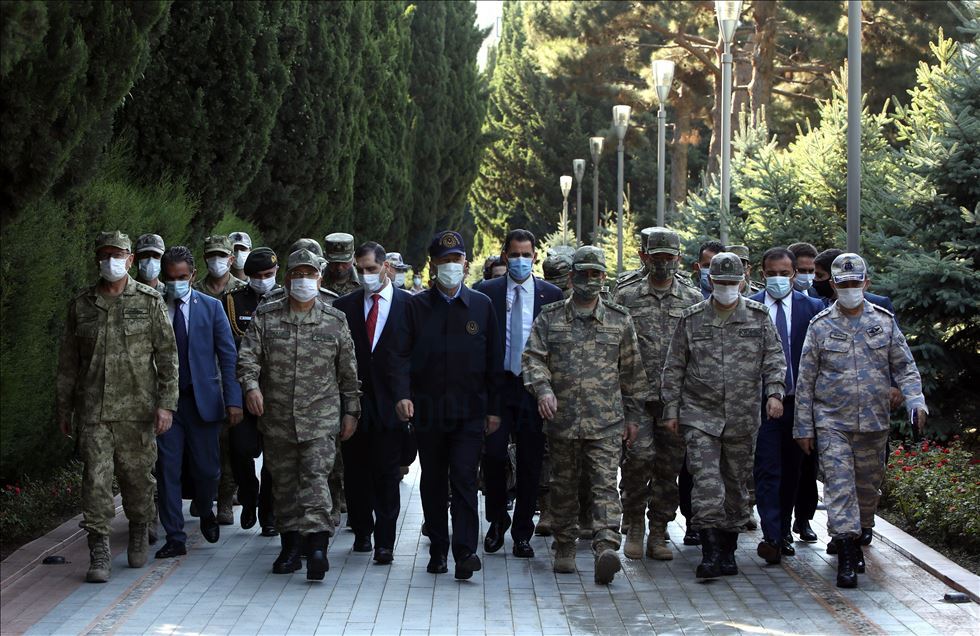 Milli Savunma Bakanı Hulusi Akar beraberinde Genelkurmay Başkanı Orgeneral Yaşar Güler, Kara Kuvvetleri Komutanı Orgeneral Ümit Dündar, Hava Kuvvetleri Komutanı Orgeneral Hasan Küçükakyüz ve Deniz Kuvvetleri Komutanı Oramiral Adnan Özbal ile geldiği Azerbaycan'daki temasları kapsamında Azerbaycan ve Türk Şehitliği'ni ziyaret etti. ( Arif Akdoğan - Anadolu Ajansı )Arif Akdoğan