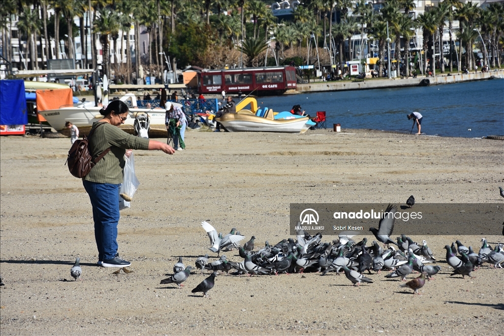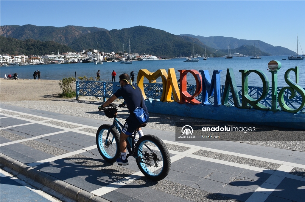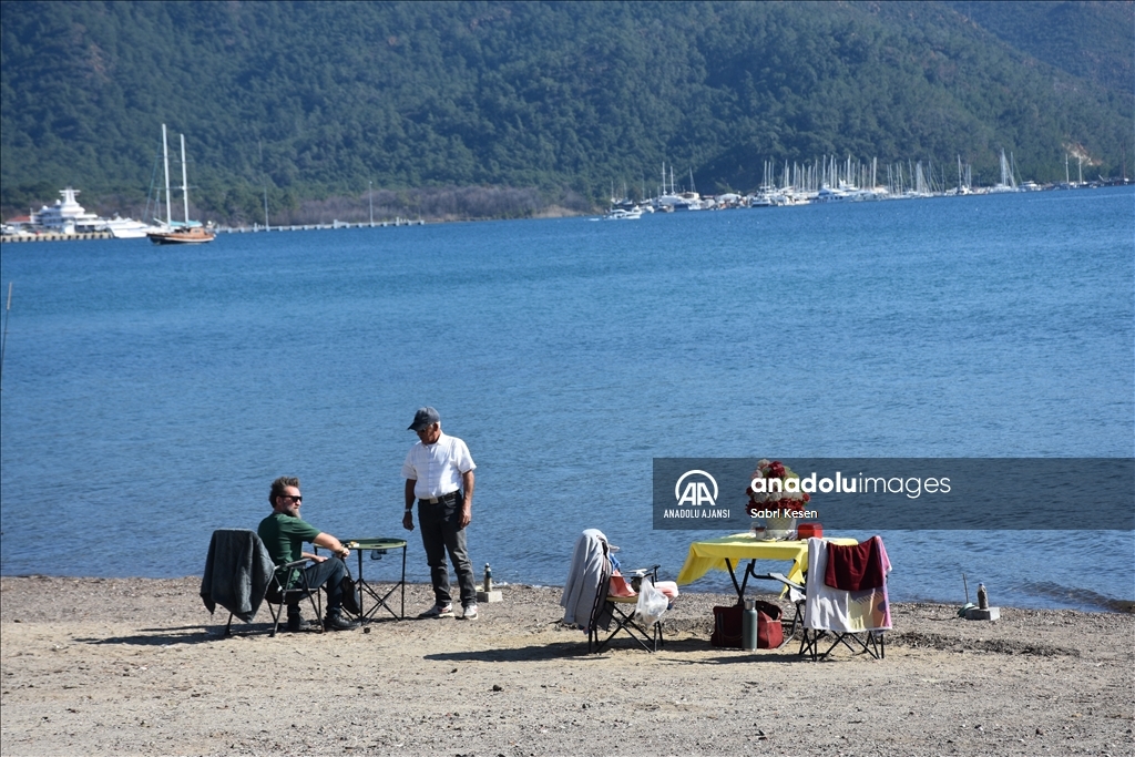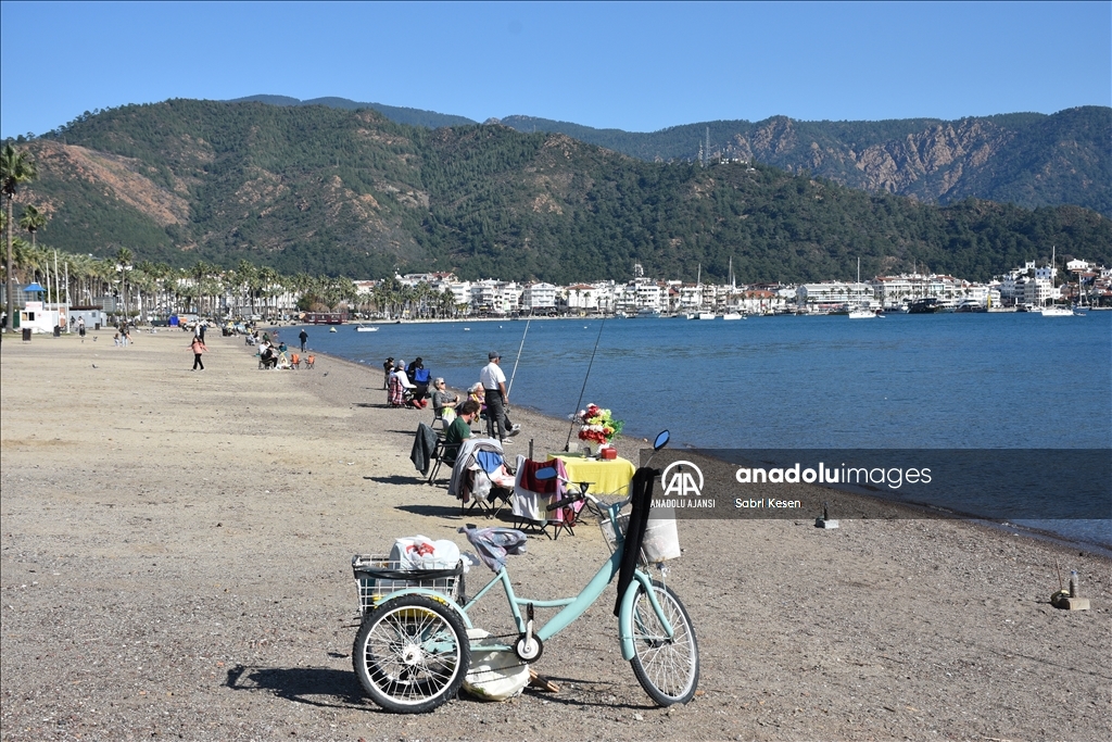 Hava sıcaklığının 21, deniz suyu sıcaklığının 19 derece ölçüldüğü Marmaris'te vatandaşlar sahillerde yürüyüş yaptı, plajlarda oturup güneşli havanın tadını çıkardı. (Sabri Kesen - Anadolu Ajansı)Sabri Kesen