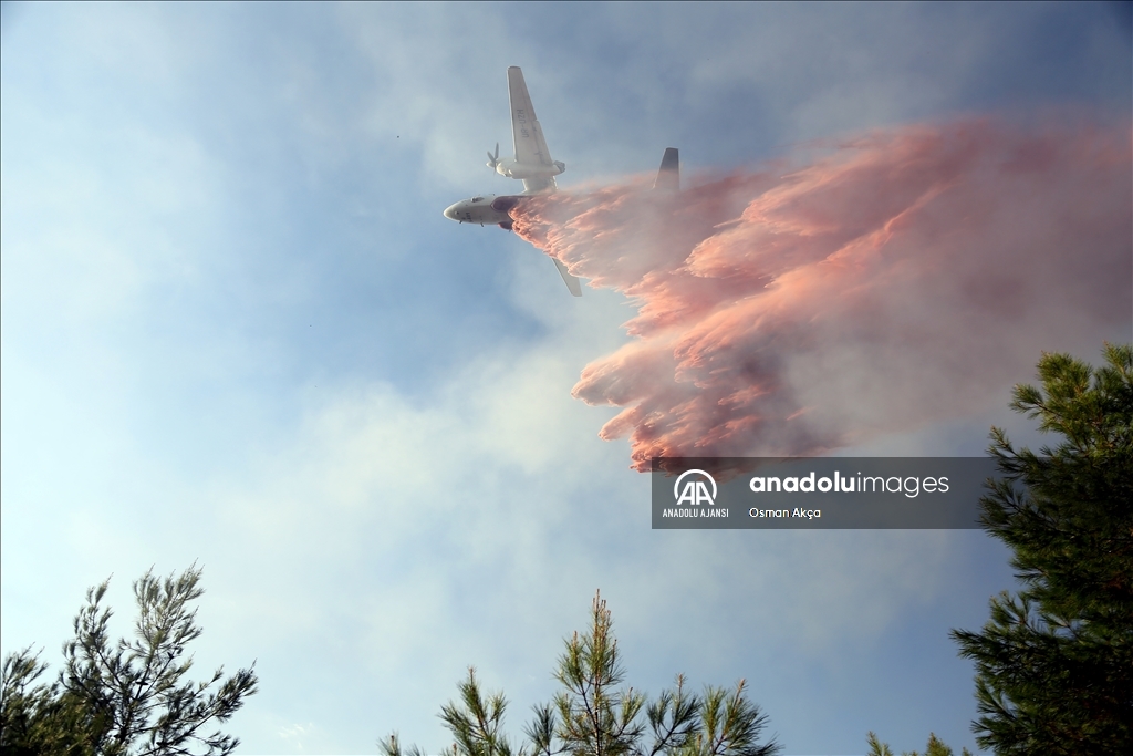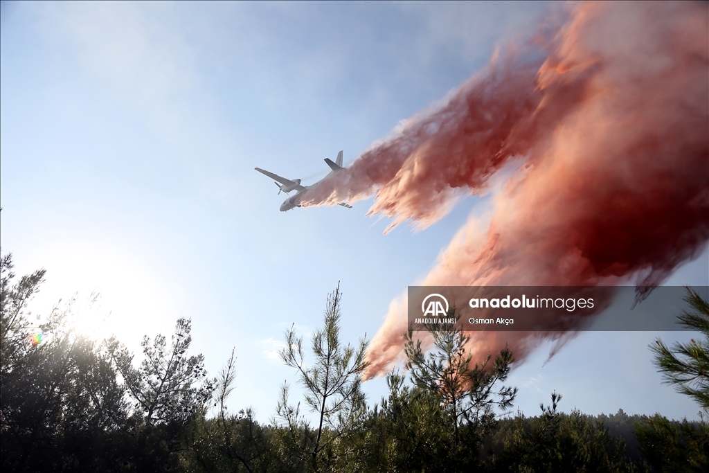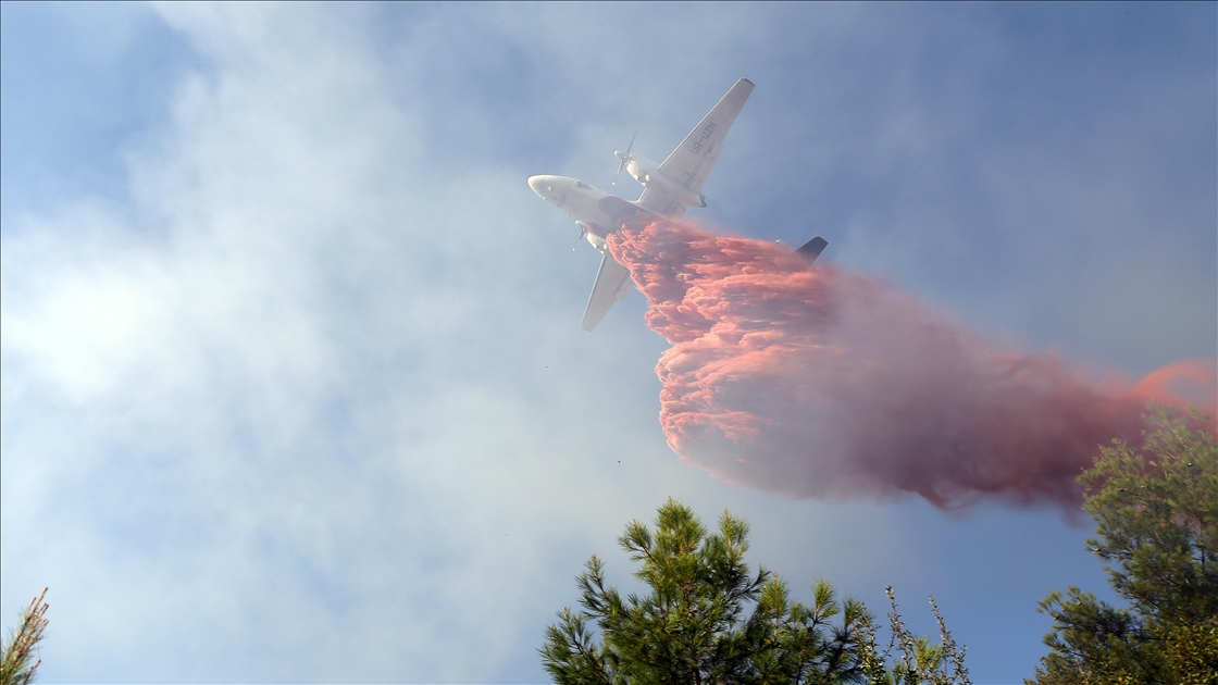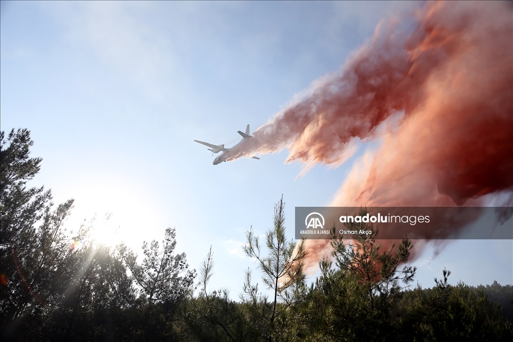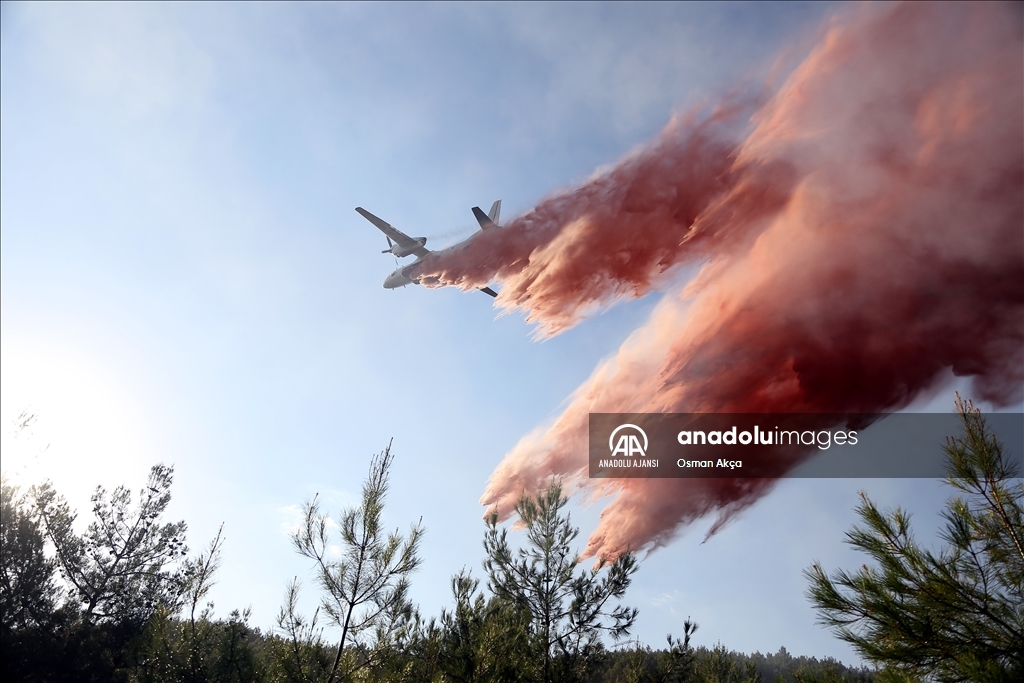 Muğla'nın Menteşe ilçesinde çıkan orman yangını havadan ve karadan müdahaleyle kontrol altına alındı. Yangın söndürme uçakları yangına kırmızı renkli sıvı ile müdahale etti.