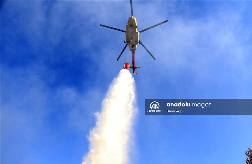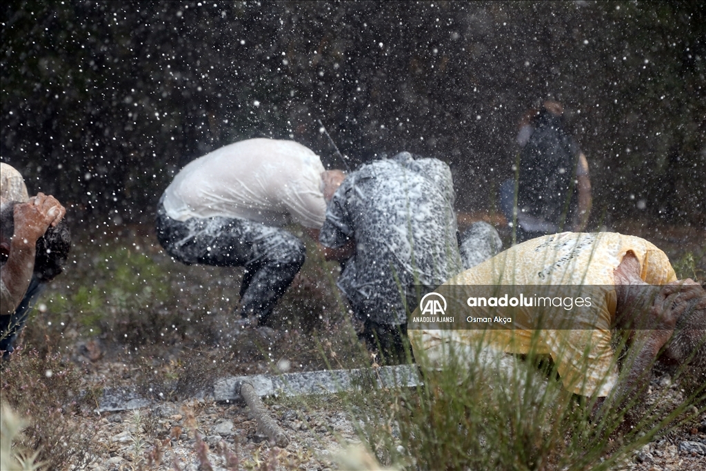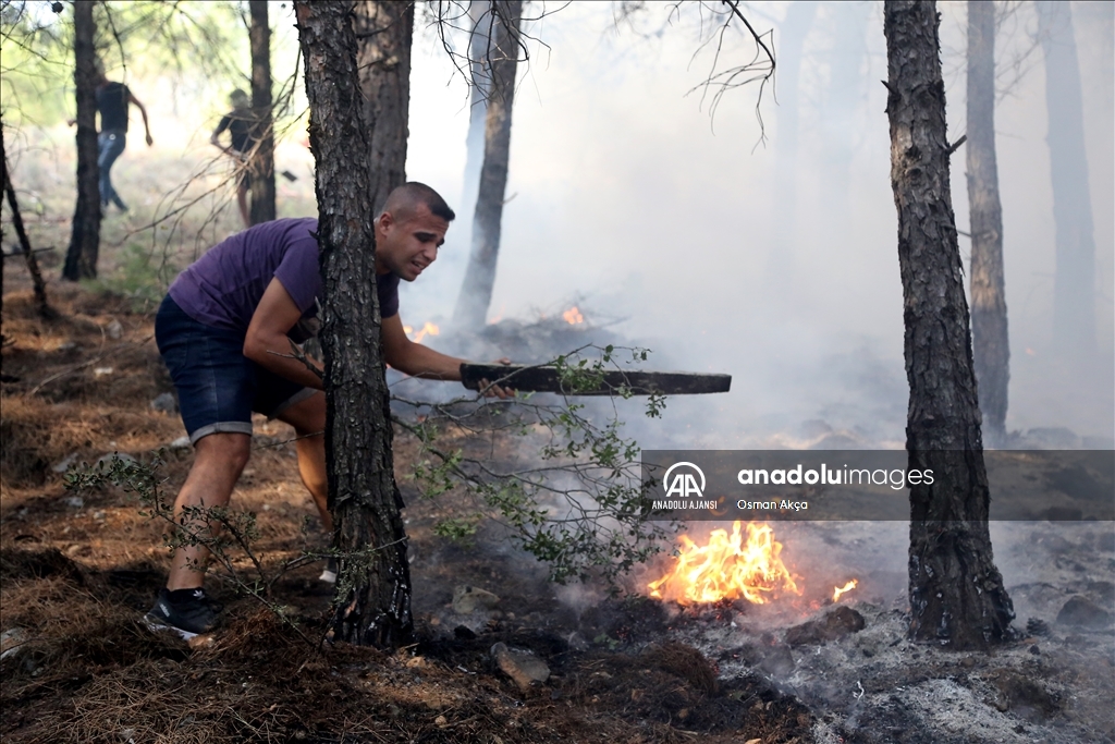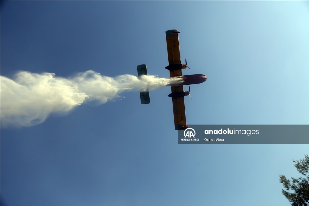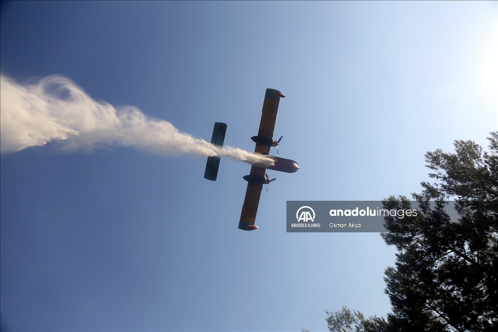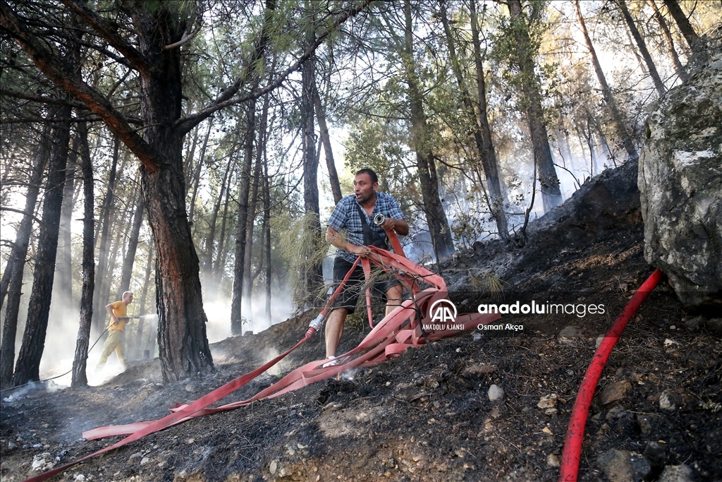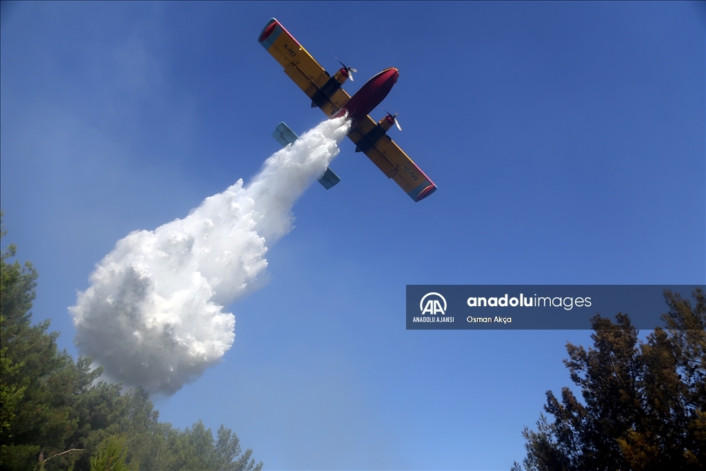 Muğla'nın Menteşe ilçesinde çıkan orman yangını havadan ve karadan müdahaleyle kontrol altına alındı. Yangına müdahale eden vatandaşlar ve görevliler havadan atılan köpüklü sudan korundular. ( Osman Akça - Anadolu Ajansı )Osman Akça