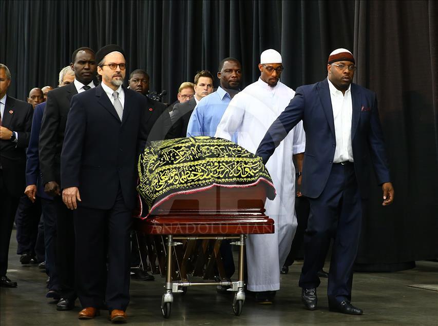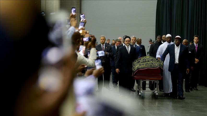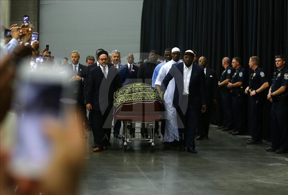 Solunum yollarındaki rahatsızlık nedeniyle 74 yaşında hayatını kaybeden ABD'li efsane boksör ve insan hakları savunucusu Muhammed Ali'nin iki gün sürecek cenaze töreni bugün Lousiville'de kılınan cenaze namazı ile başladı. Tabutun üzerindeki örtüde Kuran'ı Kerim'den ayetlerin olduğu görülürken tabutun önünde Amerikalı Müslüman toplum önderleri bir süre bekledi.