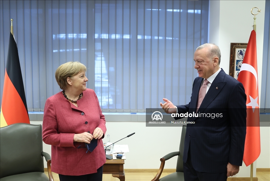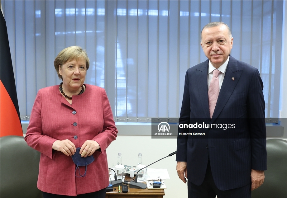 Türkiye Cumhurbaşkanı Recep Tayyip Erdoğan, NATO Liderler Zirvesi'ne katılmak üzere geldiği Brüksel'deki ikili temasları kapsamında Almanya Başbakanı Angela Merkel ile NATO Karargahı'nda görüştü. ( Mustafa Kamacı - Anadolu Ajansı )Mustafa Kamacı