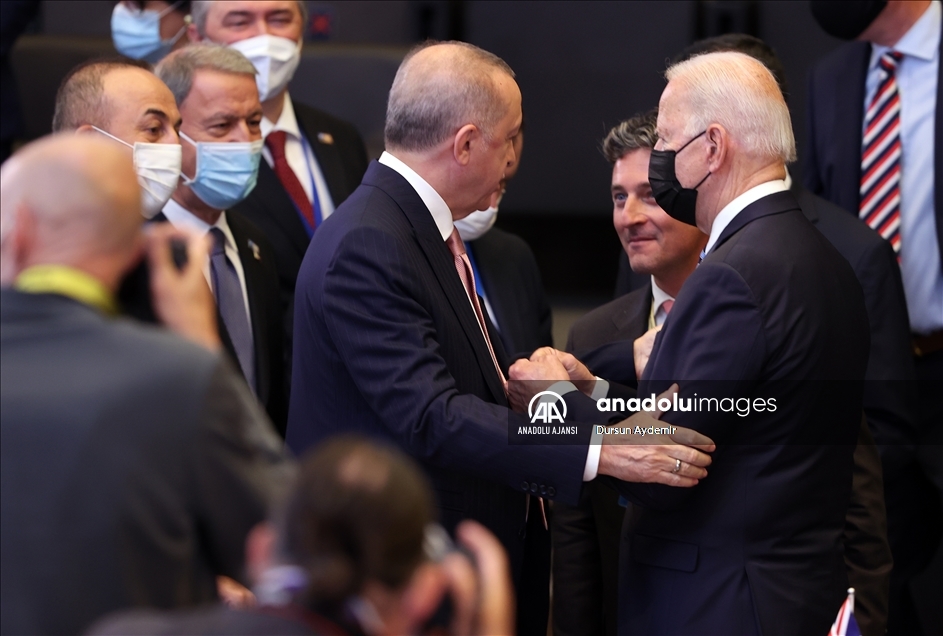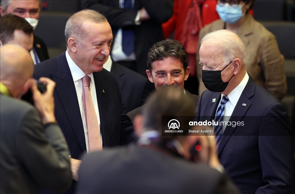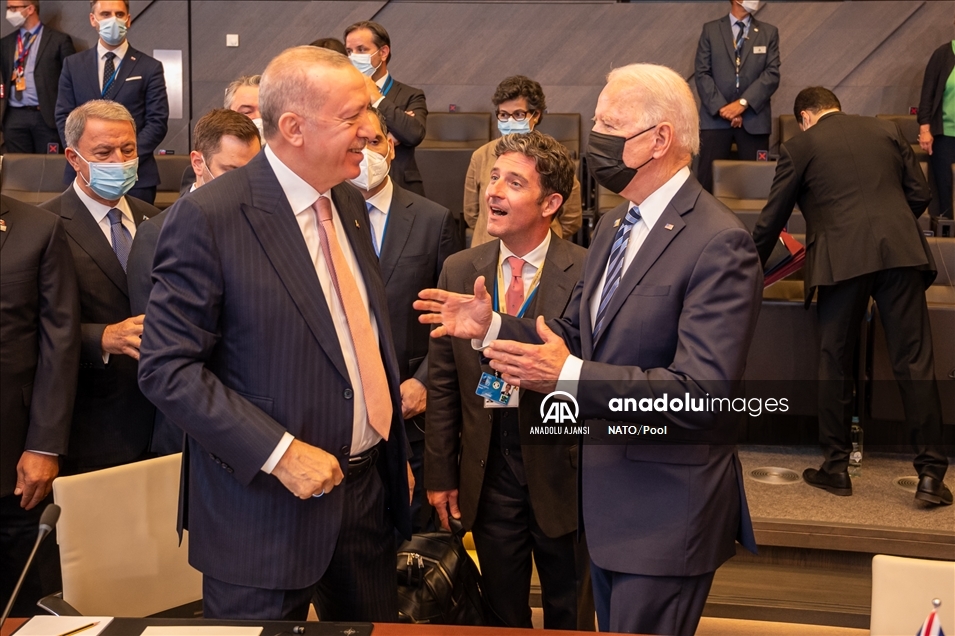 Belçika'daki NATO Devlet ve Hükümet Başkanları Zirvesi kapsamında Brüksel'de bulunan Türkiye Cumhurbaşkanı Recep Tayyip Erdoğan, ABD Başkanı Joe Biden ile toplantı öncesi sohbet etti. Toplantıya NATO Genel Sekreteri Jens Stoltenberg de katıldı. ( NATO/Pool - Anadolu Ajansı )NATO/Pool
