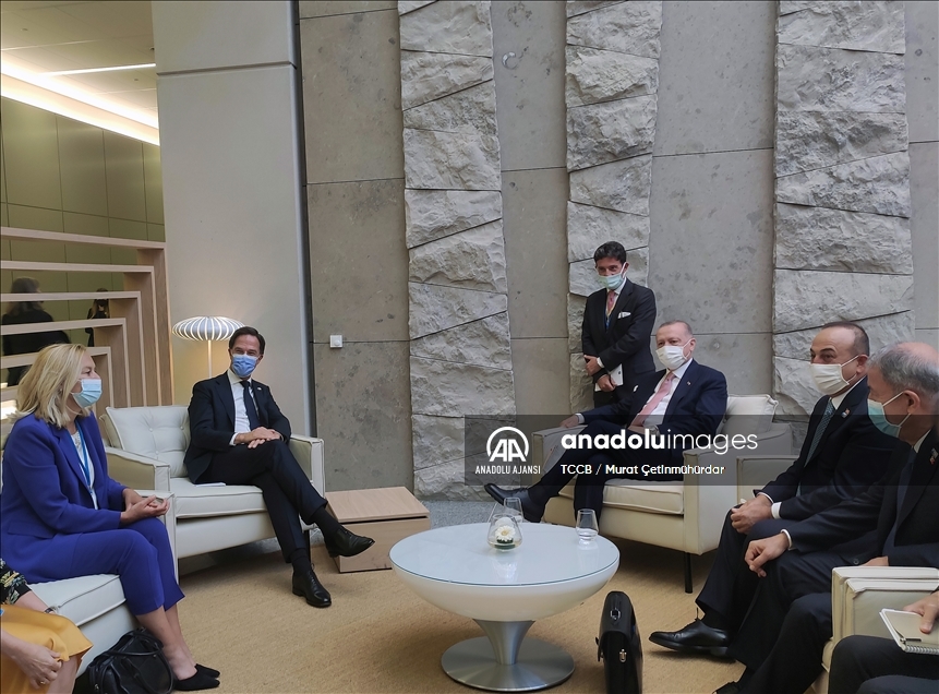 Türkiye Cumhurbaşkanı Recep Tayyip Erdoğan (ortada), NATO Zirvesi kapsamında Hollanda Başbakanı Mark Rutte'u (sol 2) kabul etti. Kabule Dışişleri Bakanı Mevlüt Çavuşoğlu (sağ 2) ve Milli Savunma Bakanı Hulusi Akar da (sağda) katıldı. ( TCCB / Murat Çetinmühürdar - Anadolu Ajansı )TCCB / Murat Çetinmühürdar