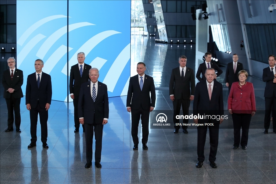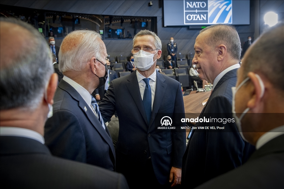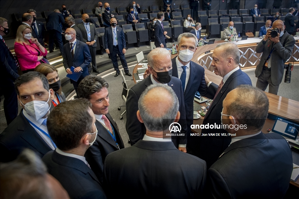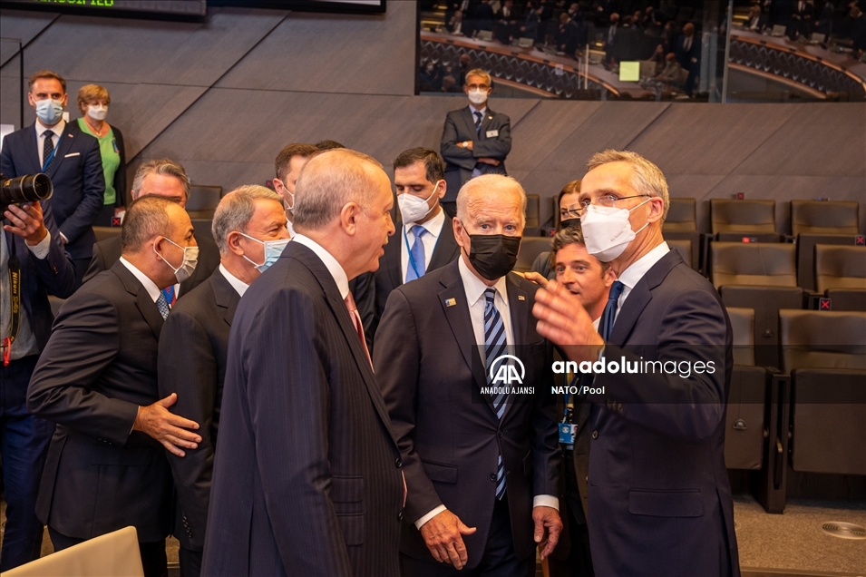 Belçika'daki NATO Devlet ve Hükümet Başkanları Zirvesi kapsamında Brüksel'de bulunan Türkiye Cumhurbaşkanı Recep Tayyip Erdoğan (sağ 3), ABD Başkanı Joe Biden (sağ 2) ve NATO Genel Sekreteri Jens Stoltenberg (sağda) ile toplantı öncesi sohbet etti. ( Dursun Aydemir - Anadolu Ajansı )Dursun Aydemir