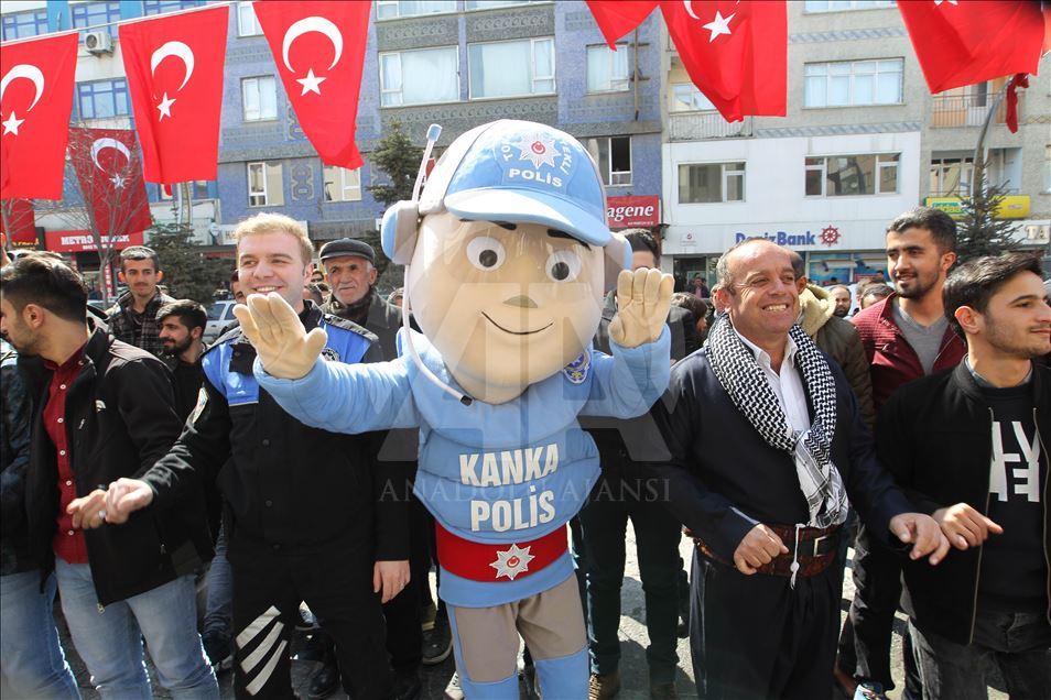 Baharın habercisi olarak kabul edilen nevruz, Hakkari'de düzenlenen etkinlikle kutlandı. Bulvar Caddesi'ndeki belediye binası önünde düzenlenen etkinliğe vatandaşlar yoğun ilgi gösterdi. Halk oyunları gösterisi ve "dengbej" dinletisi sonrasında Vali İdris Akbıyık, Belediye Başkan Vekili ve AK Parti Hakkari Belediye Başkan Adayı Cüneyt Epcim, asker, polis ve vatandaşlar Türkçe ve Kürtçe şarkılar eşliğinde halay çekti. ( Yılmaz Kazandıoğlu - Anadolu Ajansı )Yılmaz Kazandıoğlu