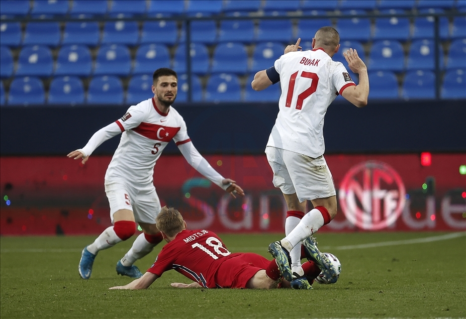 2022 FIFA Dünya Kupası Elemeleri G Grubu ikinci maçında, A Milli Futbol Takımı ile Norveç milli takımı İspanya’nın Malaga şehrindeki La Rosaleda Stadı’nda karşı karşıya geldi. Karşılaşmada, A Milli Futbol Takım futbolcuları Burak Yılmaz (sağda) ve Okay Yokuşlu (solda), rakipleri Fredrik Midtsjo (ortada) ile mücadele etti. ( Burak Akbulut - Anadolu Ajansı )Burak Akbulut