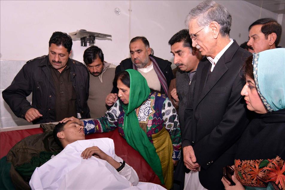 Pakistan'ın Peşaver kentinde Taliban'ın üstlendiği okul saldırısında 132'si öğrenci, 9'u öğretmen olmak üzere 141 kişi öldü, 121 öğrenci ve 7 komando yaralandı. Hayber Paktunhva Eyalet Başbakanı Pervez Hattak (sağ-2) yaralı öğrencileri hastanede ziyaret etti. (Muhammad Asad - Anadolu Ajansı)Muhammad Asad