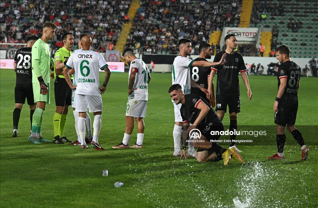 Spor Toto 1. Lig play-off finalinde Pendikspor ile Bodrumspor Spor Toto Akhisar Stadı'nda karşılaştı. Oyunun durduğu bir sırada taraftarlar sahaya su şişeleri attı. Futbolcular taraftarlara tepki gösterdi. ( Mehmet Emin Mengüarslan - Anadolu Ajansı )Mehmet Emin Mengüarslan