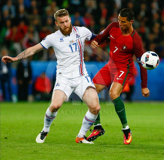 2016 Avrupa Futbol Şampiyonası (EURO 2016) F Grubu'nda Portekiz ve İzlanda, Fransa Saint - Etienne'deki Stat Geoffroy Guichard'de karşılaştı. Portekiz Milli Takımı oyuncusu Cristiano Ronaldo (sağda) İzlanda'dan Gunnarsson (solda) bir pozisyonda mücadele etti. ( Evren Atalay - Anadolu Ajansı )Evren Atalay