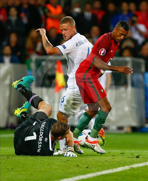 2016 Avrupa Futbol Şampiyonası (EURO 2016) F Grubu'nda Portekiz ve İzlanda, Fransa Saint - Etienne'deki Stat Geoffroy Guichard'de karşılaştı. Portekiz'den Nani (sağda) İzlanda'dan Halldorsson (solda) ve Sigurdsson (6) bir pozisyonda mücadele etti. ( Evren Atalay - Anadolu Ajansı )Evren Atalay