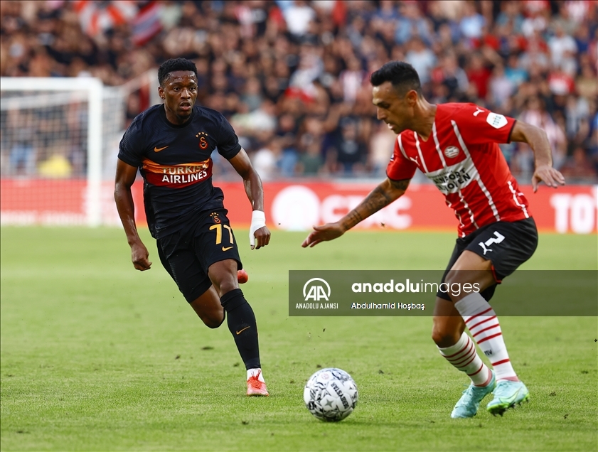 UEFA Şampiyonlar Ligi 2. Ön Eleme Turu ilk maçında Galatasaray ile PSV Eindhoven Hollanda’da PSV Stadyumunda karşılaştı. PSV’li Noni Madueke (23) rakibi ile mücadele etti. ( Abdulhamid Hoşbaş - Anadolu Ajansı )Abdulhamid Hoşbaş