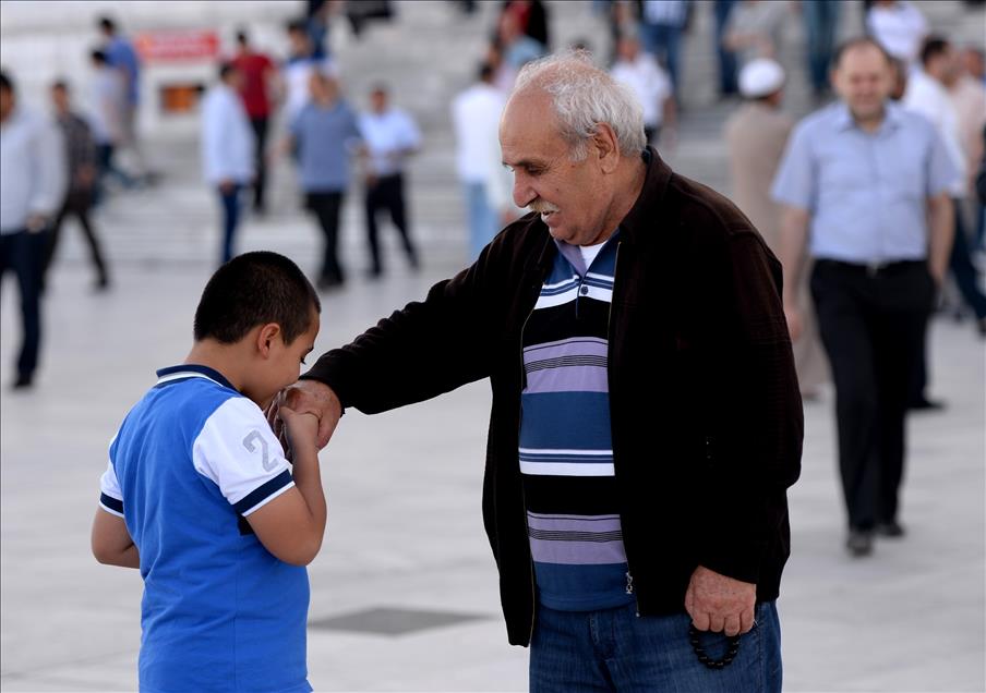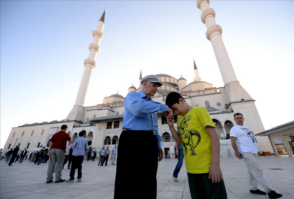 Ankara'da vatandaşlar bayram namazı nedeniyle Kocatepe Camii'ne geldi. Cami çıkışında vatandaşlar çocuklarla bayramlaştı. (Okan Özer - Anadolu Ajansı)Okan Özer