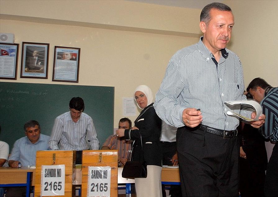 2003 yılından bu yana Başbakanlık görevini yürüten AK Parti Genel Başkanı Recep Tayyip Erdoğan, Cumhuriyet tarihinde ilk kez halk tarafından seçilen Cumhurbaşkanı oldu. 3 adayın yarıştığı ve 52 milyon 894 bin seçmenin oy kullandığı seçimde Erdoğan oyların yüzde 51.85’ini alarak siyası yaşamında yeni bir başarıya daha imza attı. Siyasi kariyeri boyunca il başkanlığı, belediye başkanlığı, milletvekilliği ve başbakanlık görevlerini icra eden Erdoğan, bundan sonra 12. Cumhurbaşkanı olarak Çankaya Köşkü’ne ev sahipliği yapacak. Başbakan Erdoğan ve eşi Emine Erdoğan 22 Temmuz 2007'de düzenlenen Genel Seçimlerde oylarını Üsküdar'da kullandı.(Arşiv) (Erhan Sevenler - Anadolu Ajansı)Erhan Sevenler