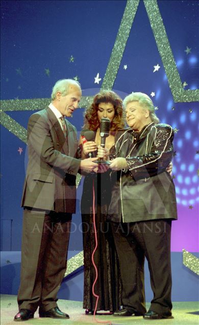 Türkiye'nin "Sanat Güneşi" olarak anılan sanatçı Zeki Müren, vefatının 23. yılında yad ediliyor. 24 Eylül 1996'da sanatçı Zeki Müren (sağda), TRT İzmir stüdyolarında kendisi için hazırlanan törende (Arşiv)